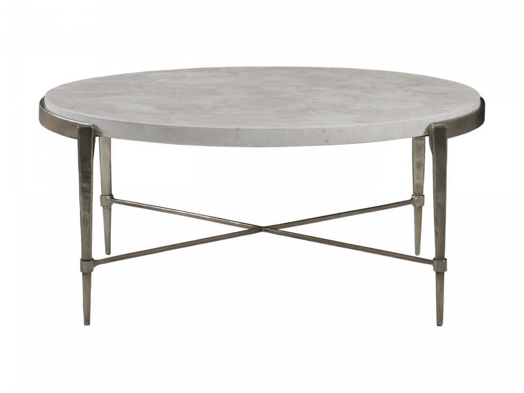 Product Description: Artistica Home 2319-943 Signature Designs Percival Cocktail Table - Transitionally styled in hand-forged and tapered iron with shaped aprons in a bronze leaf finish securing tops in veneered White Agate fossil stone with a light sheen. Fossilstone is a product of nature and will vary in coloration from piece to piece.