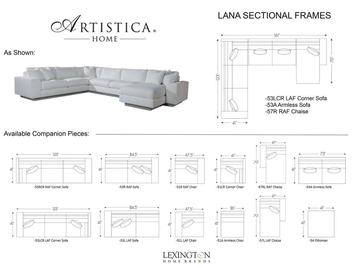 Product Description: Artistica Home 2410-SECT Lana Sectional - The Lana series features a bold 11-inch track arm silhouette - distinctive as a result of the graceful radius of the inside arm. The profile softens the contemporary lines, offering an invitation to relax in exceptionally plush Ultra Down cushioning. The inset plinth base conveys a clean architectural feel to the design and lightens the look by offering a floating appearance. The wooden base is available in your choice of 40 custom finishes.