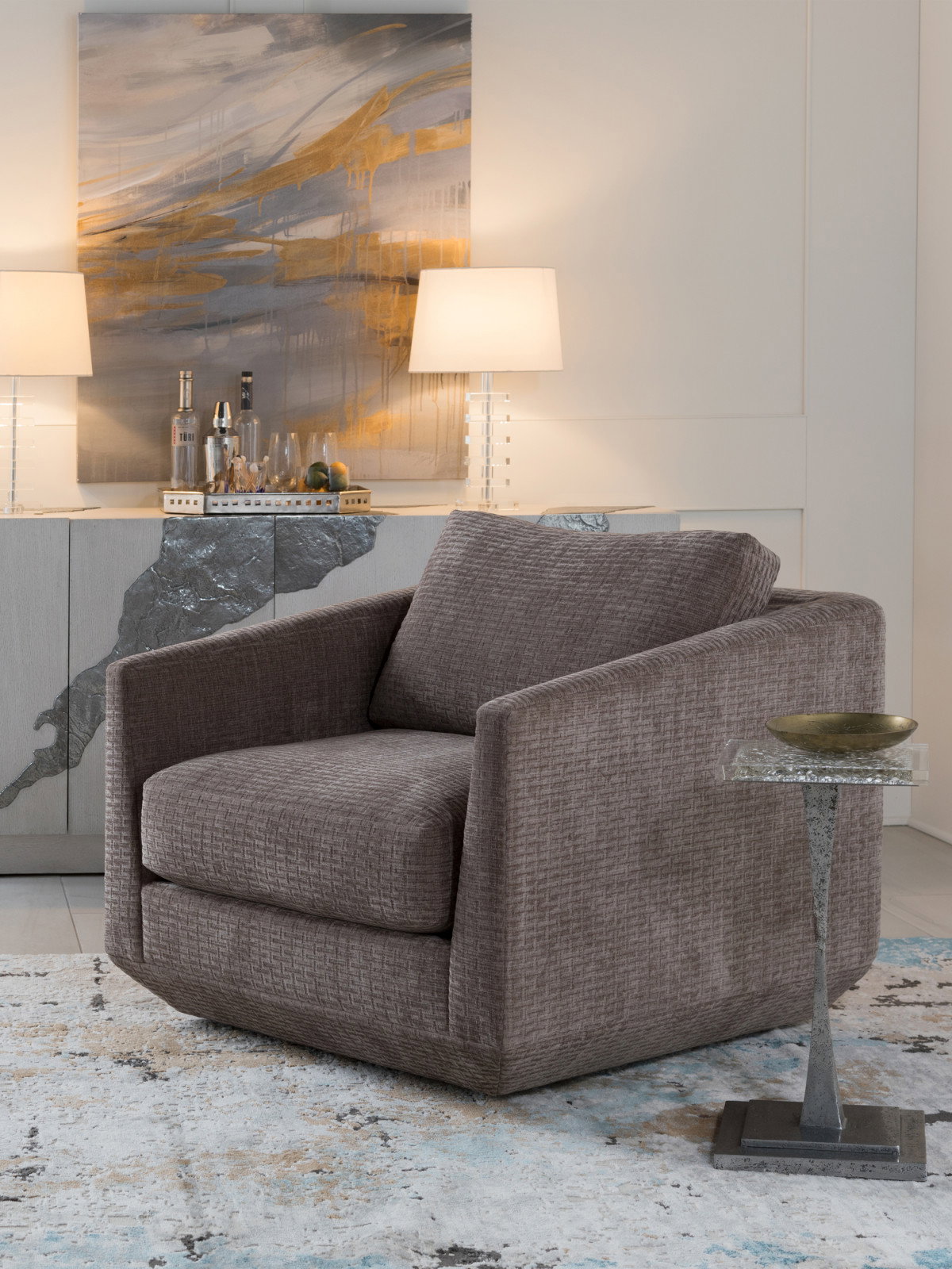 Product Description: Artistica Home 2411-11SW Veronica Swivel Chair - Contemporary form featuring a sloping shelter effect and marked by a unique chamfered base upholstered all the way to the floor. The Veronica is a combination of geometric straight lines and tapering trapezoidal shapes contrasted by the radius curves joining the sloped arms to the back rail and the visual softness of our thick cushioning and back pillow. Due to the design, striped fabrics are not recommended.