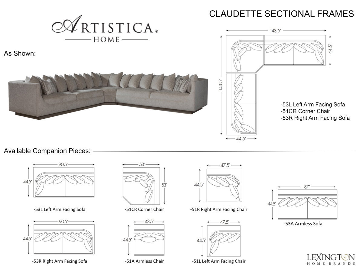 Product Description: Artistica Home 2413-SECT Claudette Sectional - Stunning transitional form hallmarked by long, gentle curves capturing a thick bench seat and tapering up to create a shelter effect that finishes in a sleek, narrow arm. The dramatic recessed plinth and deep back rail lend an architectural vibe to what is otherwise a statement in chic, pillowy comfort. This sectional configuration includes nineteen 22-inch blend down back pillows and three 18-inch lux down throw pillows. The plinth base may be finished in your choice of upholstery finishes.