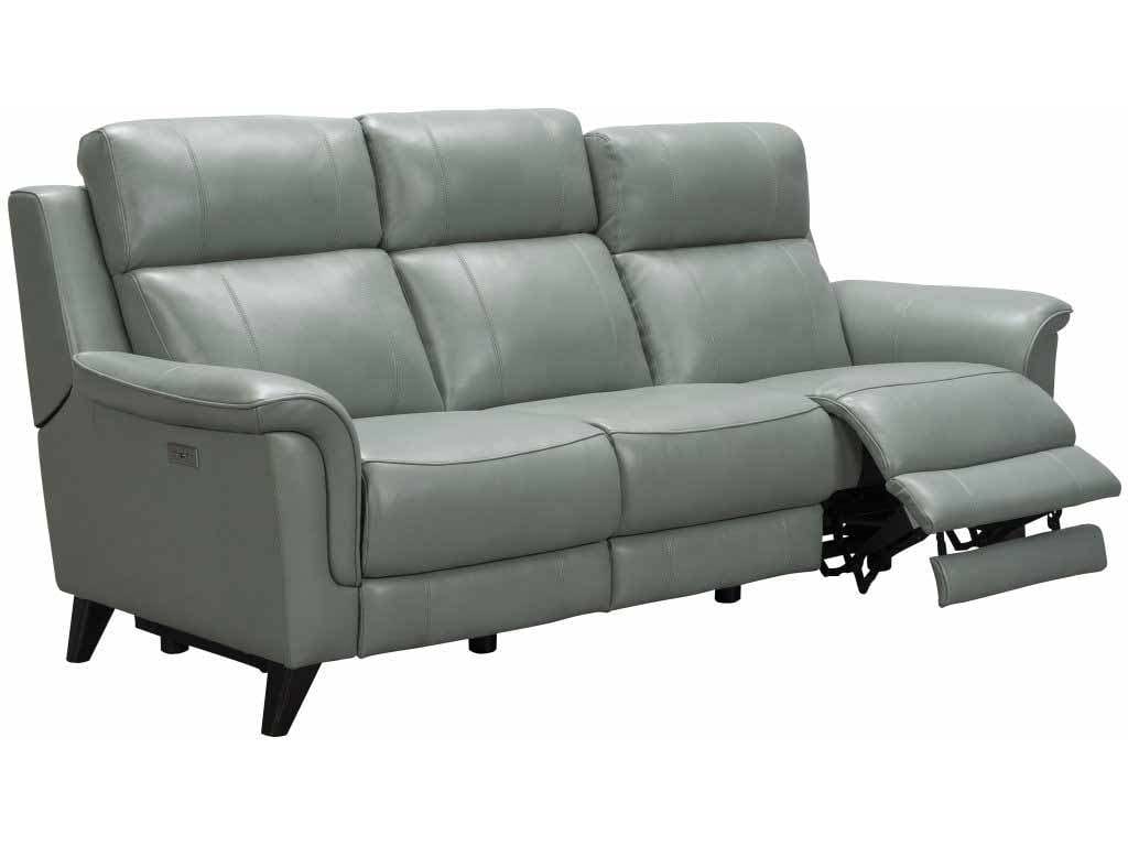 Product Description: BarcaLounger 39PH-3716-3729-45 Kester Power Recline Sofa Lorenzo Mint - Mid-century modern elevated reclining sofa group with power recline and power headrest. This group features box seat styled pad over chaise seating with pocketed coil springs, tucked pillow arms, and clean line pub backs. Power buttons have USB ports to keep your devices charged. Matching loveseat and recliner available. Legs are finished in a dark teak color.