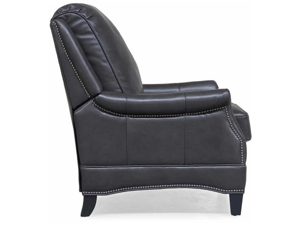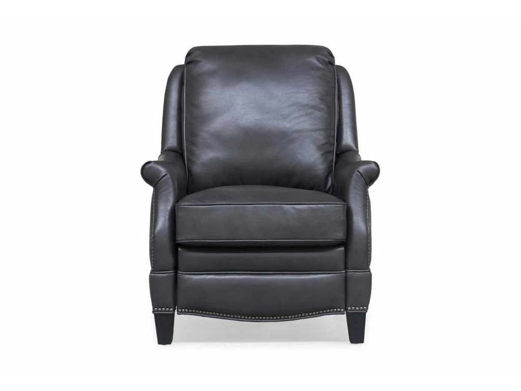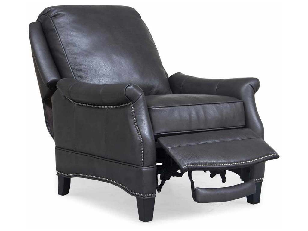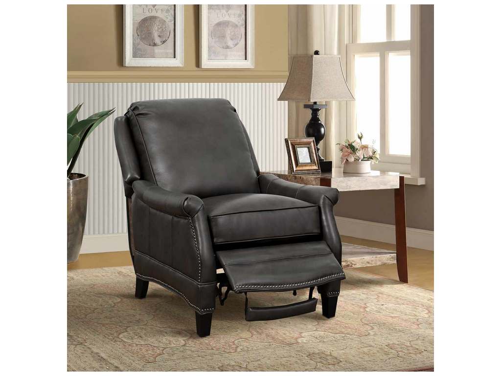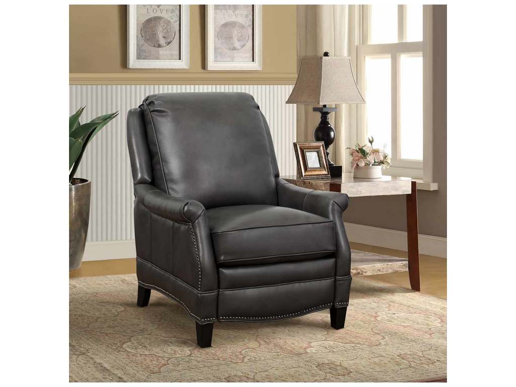 Product Description: BarcaLounger 7-3056-5494-92 Ashebrooke Low Leg Recliner Wrenn Gray - Smaller scale push thru the arms 3-way recliner with footrest extension, flared rolled arms, nail head trim on the shaped lower side rails and ottoman. Attached back cushion. Welted loose box seat cushion with pocketed coil springs and a down blend feather topper. Merlot finished tapered wood legs.