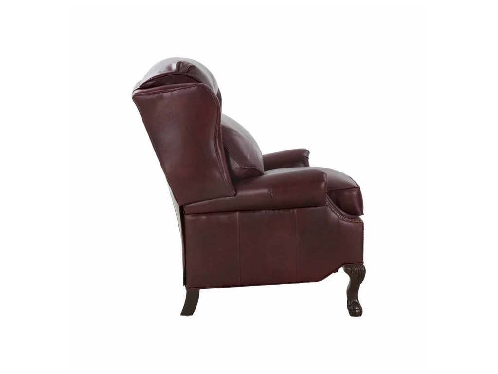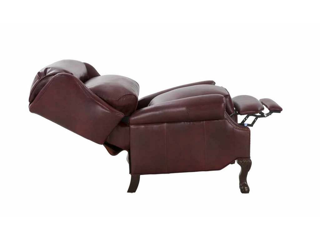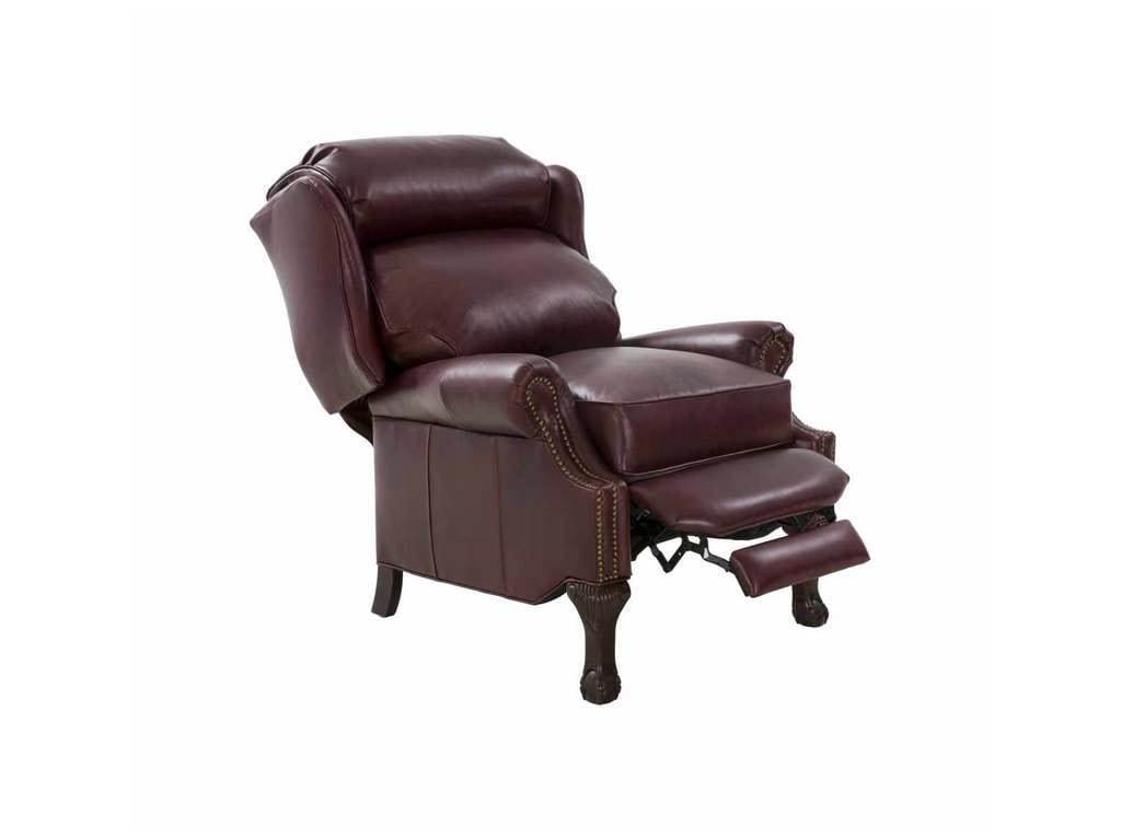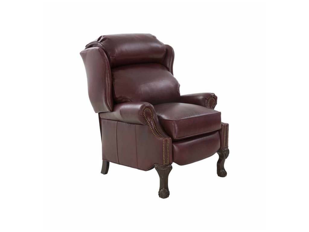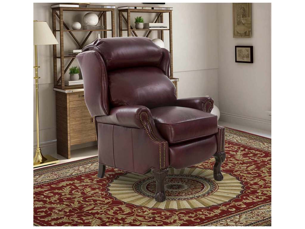 Product Description: BarcaLounger 7-4199-5710-76 Danbury Recliner Emerson Sangria - Stately sculptured wingback 3 way recliner with ball and claw legs, kneed back rolled arms with nail head trim accents. Adjustable zippered upper and lower back pillows, loose welted boxed seat cushion with pocketed coil springs encased in foam wrapped in Dacron with a down blend topper. Footrest extension for extra leg support. Hand carved woods legs are finished in an Espresso finish.