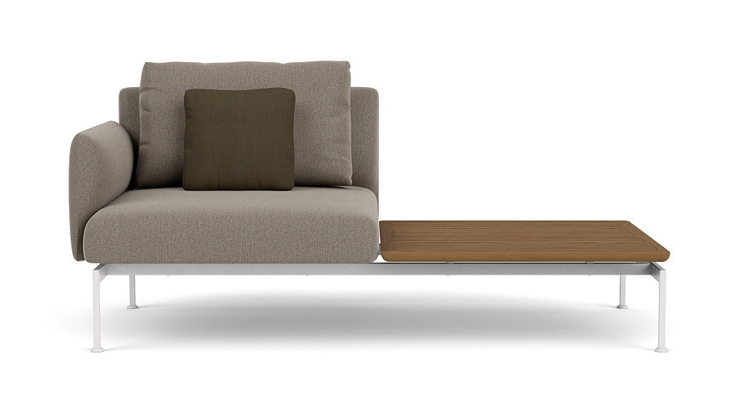 The Layout collection of modular deep seating offers many possibilities. Upholstered backs and arms are separate units that can fit on any side of the seating units to create sofas, corner sectionals, loungers, chairs, ottomans and many asymmetric configurations. Designed by award-winning international designers Andrew Jones and Nathalie de Leval. The collection comprises two sizes of upholstered seats and five tables, making intimate or grand seating groups possible. The refined frames are made from 316 marine-grade powder-coated stainless steel, available in two colors. The Layout dining collection combines refined 316 marine-grade powder-coated stainless steel frames with teak seats and tabletops. Layout dining complements Layout Deep Seating perfectly.
