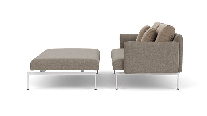 The Layout collection of modular deep seating offers many possibilities. Upholstered backs and arms are separate units that can fit on any side of the seating units to create sofas, corner sectionals, loungers, chairs, ottomans and many asymmetric configurations. Designed by award-winning international designers Andrew Jones and Nathalie de Leval. The collection comprises two sizes of upholstered seats and five tables, making intimate or grand seating groups possible. The refined frames are made from 316 marine-grade powder-coated stainless steel, available in two colors. The Layout dining collection combines refined 316 marine-grade powder-coated stainless steel frames with teak seats and tabletops. Layout dining complements Layout Deep Seating perfectly.