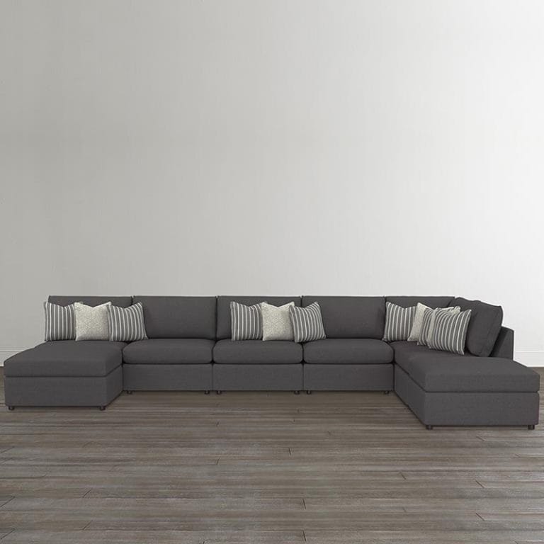 Shown in Charcoal. A transitional modular sectional with endless possibilities. Beckham has limited skus but can transform into as large or small as needed to fill your room. All pieces are welt less with box seat cushions and loose knife edge back. The legs are finished in Walnut.