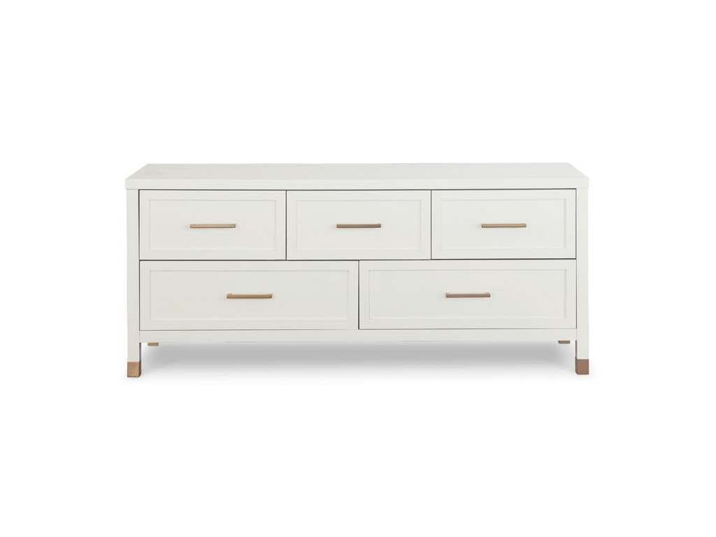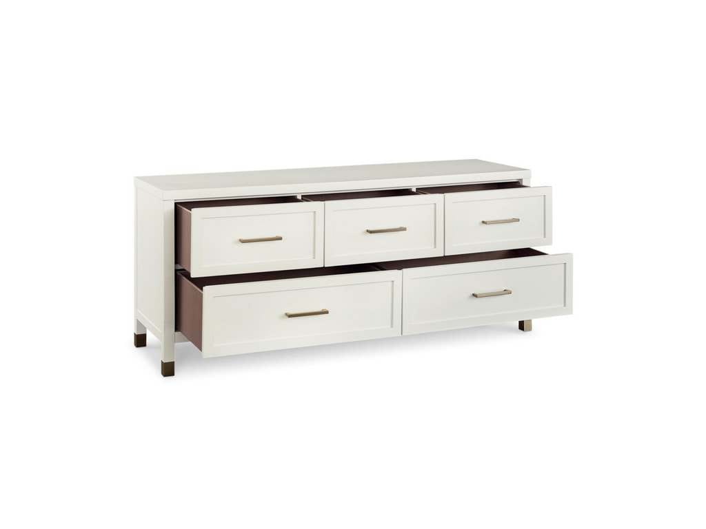 Product Description: Bassett Furniture 2977-0238 Tidewater 5 Drawer Dresser - Under a window or along the wall, the classic Tidewater 5 Drawer Dresser brings a hint of mid-century modern style with its low profile. Its smooth, opaque Hampton White finish is both modern and timeless at once, accented with raised framing on the drawer fronts and sides. Metal bar pulls and leg ferrules in satin brass finish add a touch of class. Each of the five drawers shows the lasting craftsmanship of English dovetail joinery and a soft-close drawer guide system mounted under the drawer. A cedar-lined bottom drawer provides extra protection for your sweaters and woolens. With its clean, straight lines, this stylish low dresser is just as comfortable in an elegant boudoir as it is in a coastal getaway.