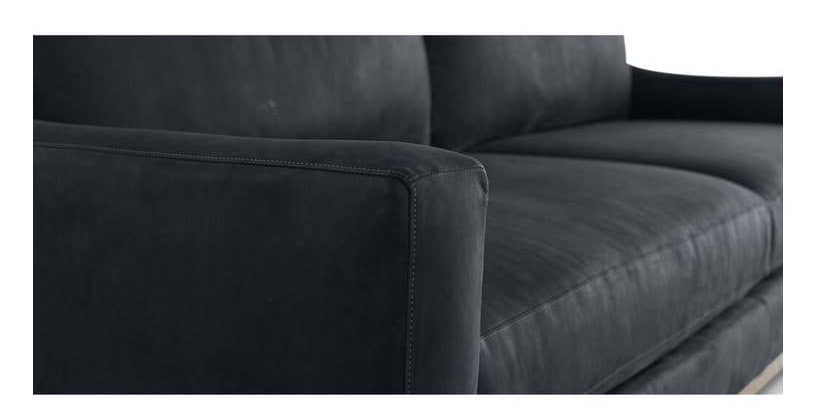 Product Description: Bassett Furniture 3135-42L Sanford Leather Loveseat - This contemporary piece is a presence in any room with wide cushions and dramatic sloping arms. The modern feel is enhanced by a low seat and tall wooden leg, creating a lighter feel on a substantial piece. The Sanford Leather Loveseat also features the designer chosen Benchmade leathers, all top grain, all aniline dyed picked for depth of color and softness of hand. Also available in a range of fabric colors and textures in store.