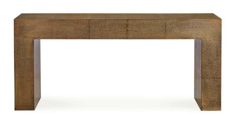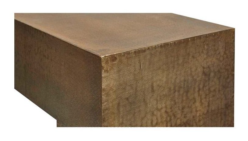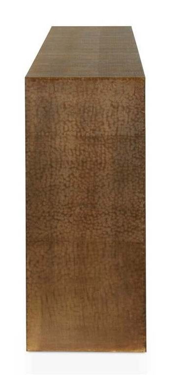 Product Description: Bassett Furniture 6206-0699 Vansant Console Table - The Vansant console table with a sleek, structure-like design with a rough-hewn finish adds a modern classic style to any space. Covered in copper and zinc alloy cladding, powder coated in a brass finish. The hammered texture is done by hand giving each table a unique appearance and one-of-a-kind character.