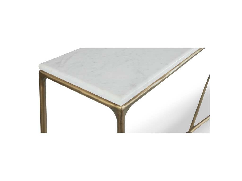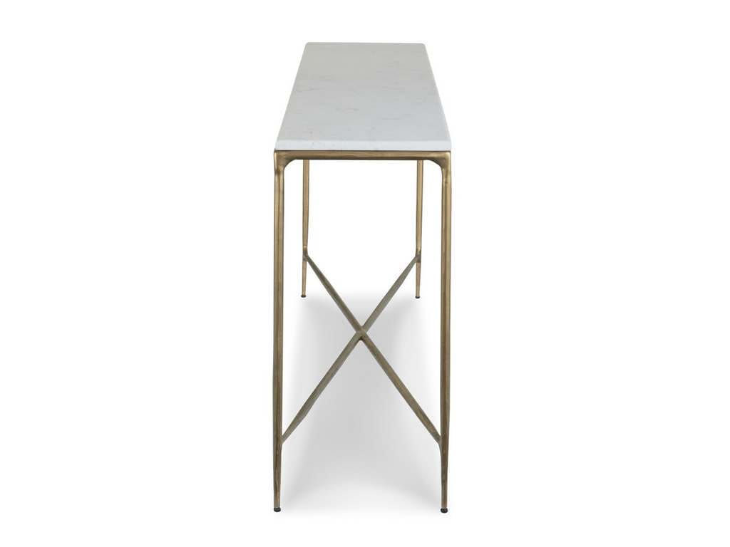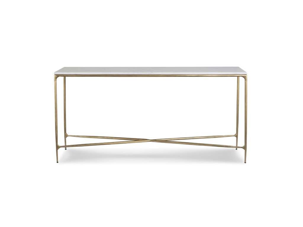 Product Description: Bassett Furniture 6216-K699 Keswick Console Table - A treasured piece in enduring Banswara marble, the Keswick console table brings rustic elegance to an entryway or hallway. Natural streaks of blush, gray, and purple vein the lustrous white marble, adding interest to the smooth-edged beauty of the stone. Slender, gently tapered legs are visually strengthened with cross support. The distressed bronze finish comes from a carefully hand-applied, durable, and low-maintenance powder coat. This highly prized Banswara marble table is sealed for protection, though coasters are still recommended.