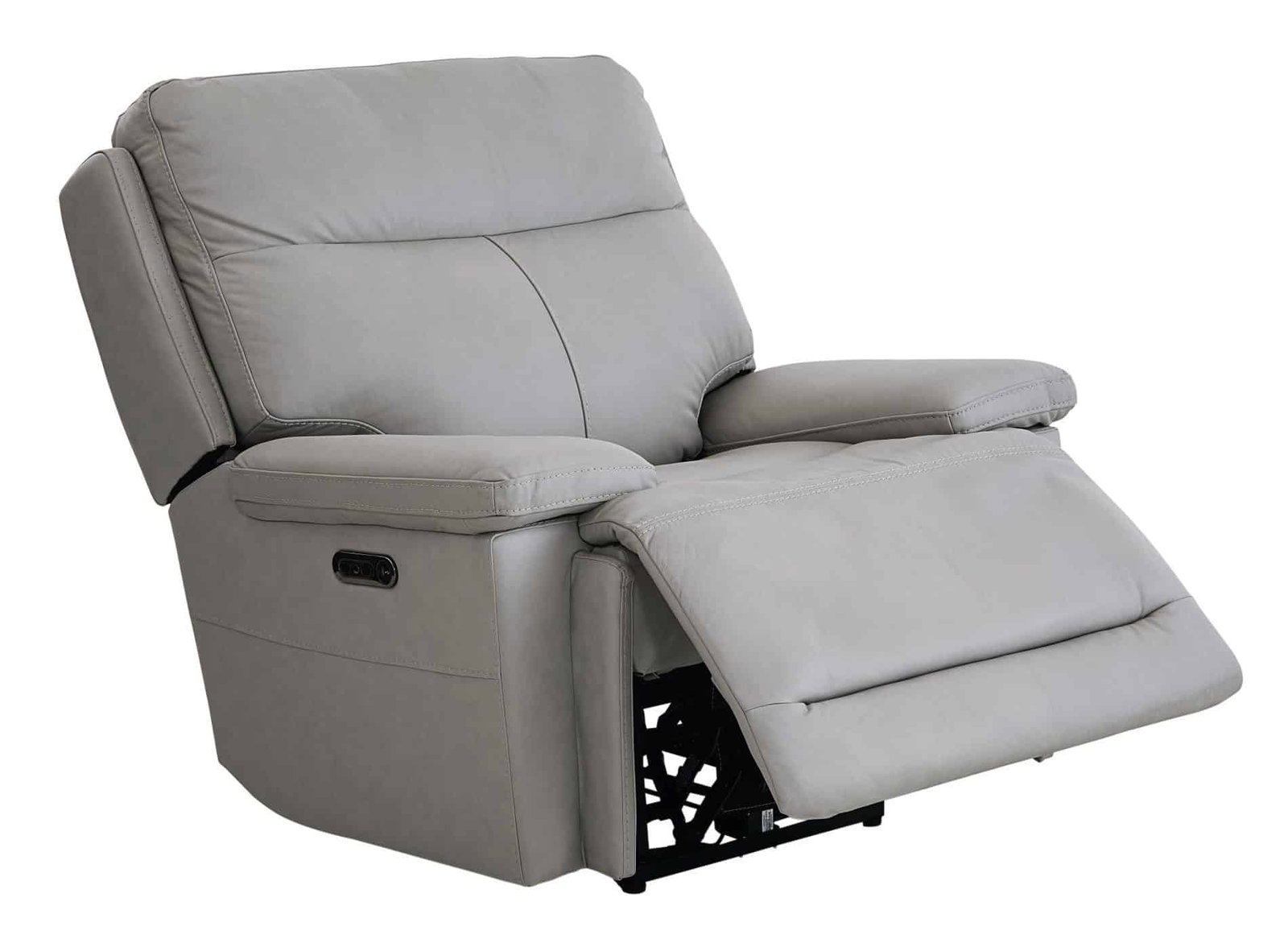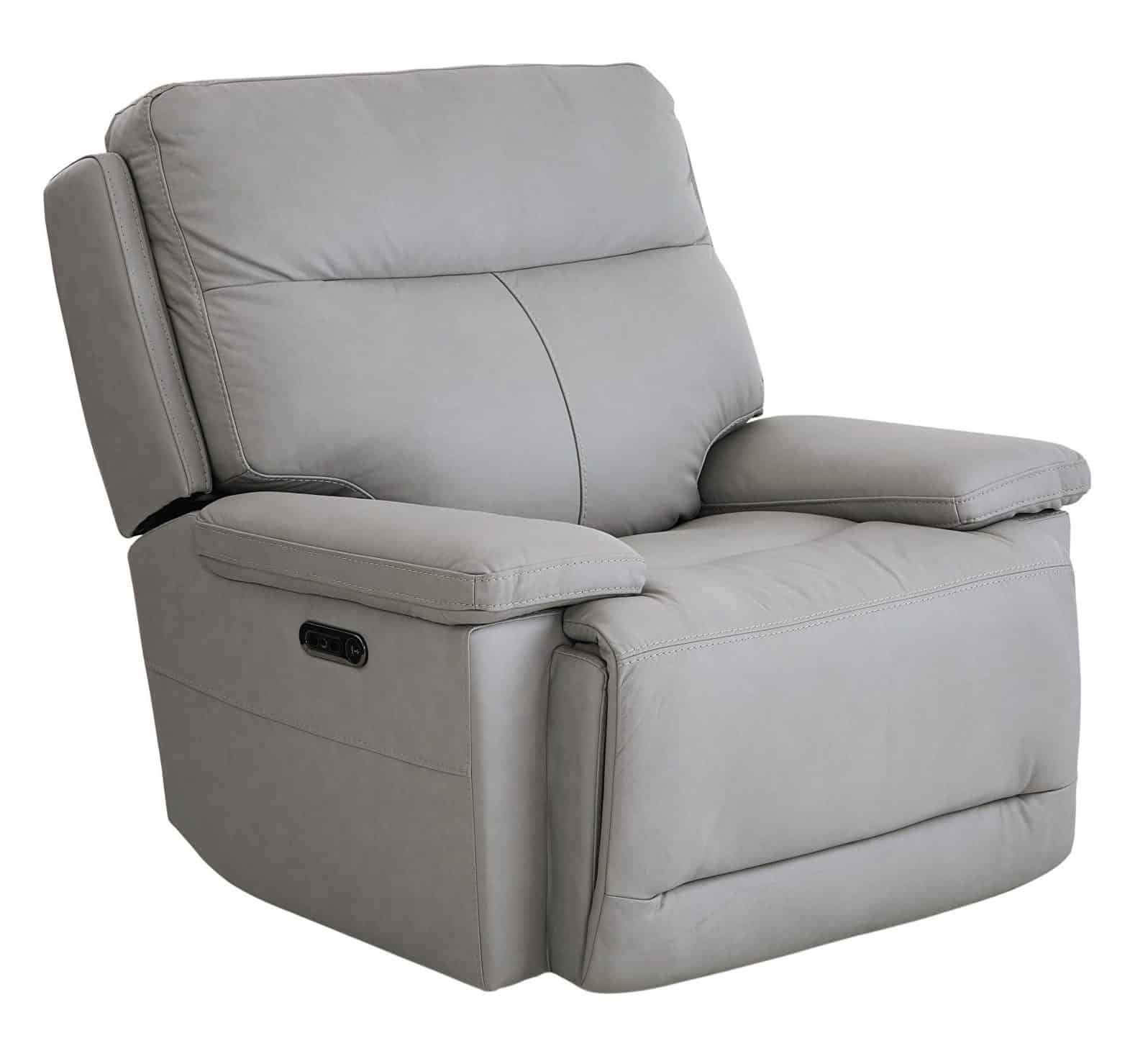 Product Description: Bassett Club Level 3733-P0G Fletcher Wallsaver Power Recliner Gray Leather - Fletcher features generous scale and comfort, tailored for a clean upscale look with soft padded arms. The top grain leather (with vinyl match) comes in two colors - Antelope and Gray. Fletcher features a power "zero-gravity" mechanism for the ultimate in comfort with a power adjustable headrest. With USB charging ports built into the controls, Fletcher keeps you powered up and relieves your stress with unmatched comfort.