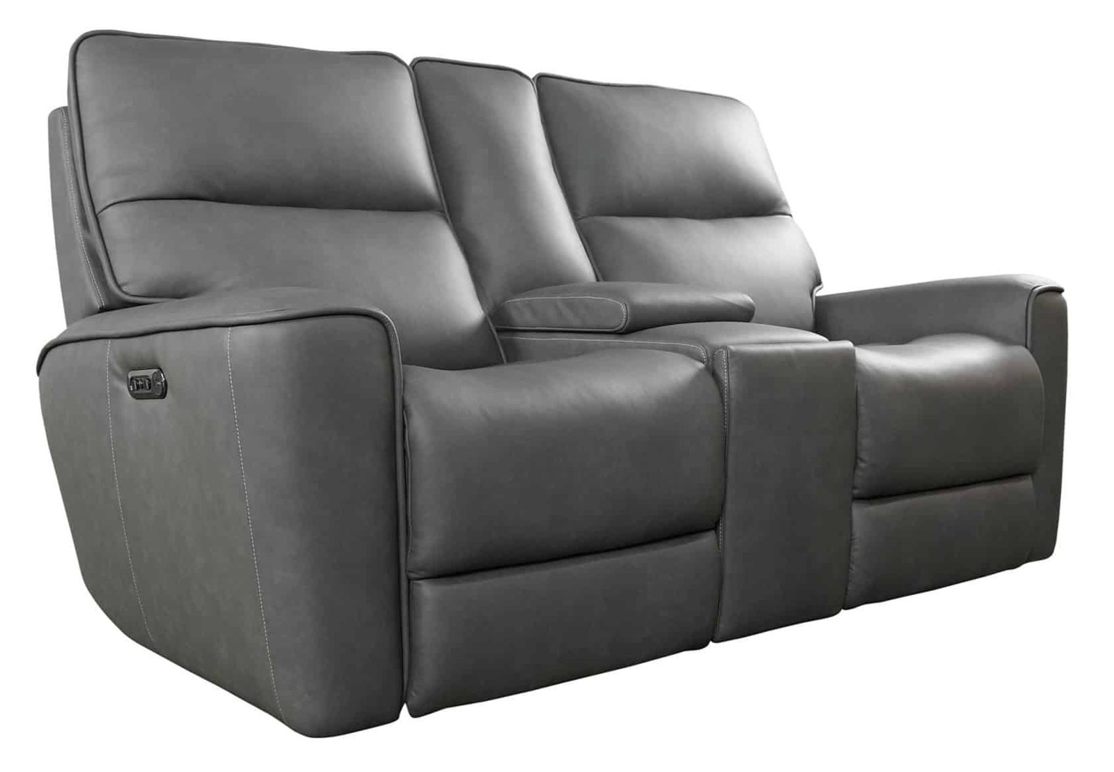 Product Description: Bassett Club Level 3797-PC42G Kenneth Power Motion Loveseat Console Gunmetal Leather - Kenneth features generous scale and comfort, tailored for a clean upscale look, with an oversized welt to frame the silhouette. The top grain leather (with vinyl match) comes in two colors – Gunmetal and Mist. Kenneth features a power “zero-gravity” mechanism for the ultimate in comfort with a power adjustable headrest. With USB-A and USB-C charging ports built into the controls, Kenneth keeps you powered up and relieves your stress with unmatched comfort.
