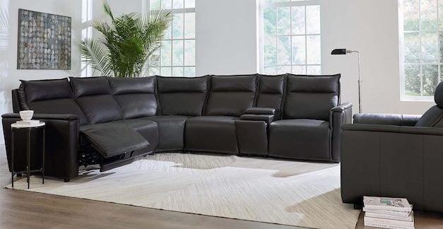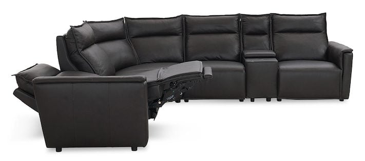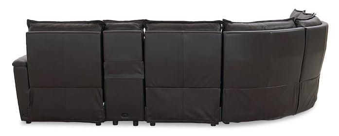 Product Description: Bassett Club Level 3799-MSECTE Chauncey Leather Power Reclining Sectional - Chauncey Expresso - This power reclining sectional combines modern style with ultimate comfort. Zero-gravity recliners with adjustable headrests, plush back cushions, and padded arms offer personalized support, while a center console with wireless charging and hidden cup holders adds convenience. Crafted in select top-grain leather with vinyl match, Chauncey creates a welcoming, luxurious space to relax.