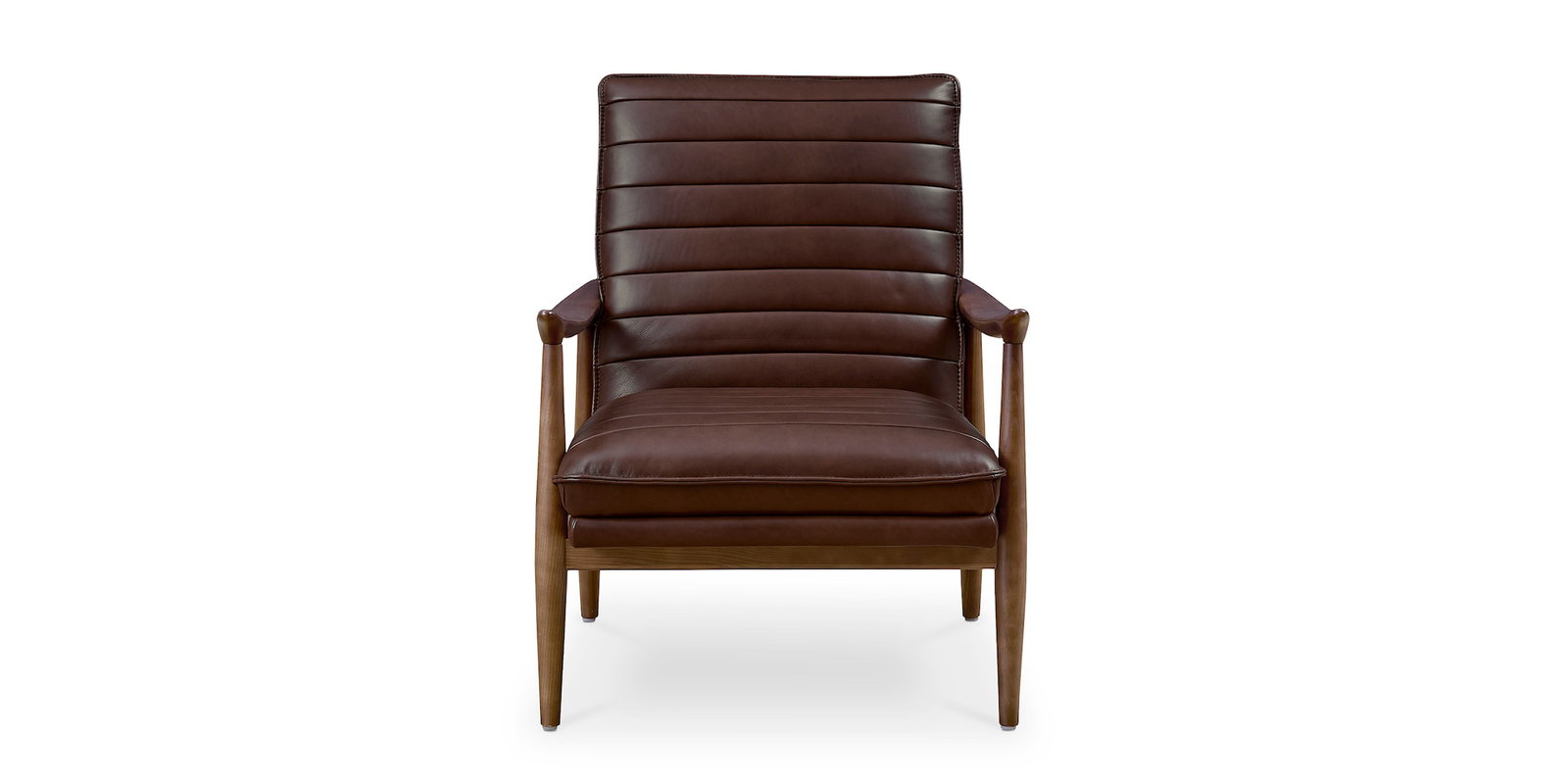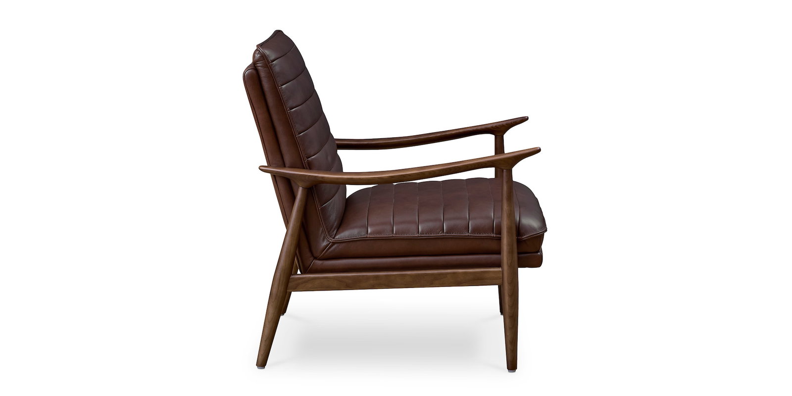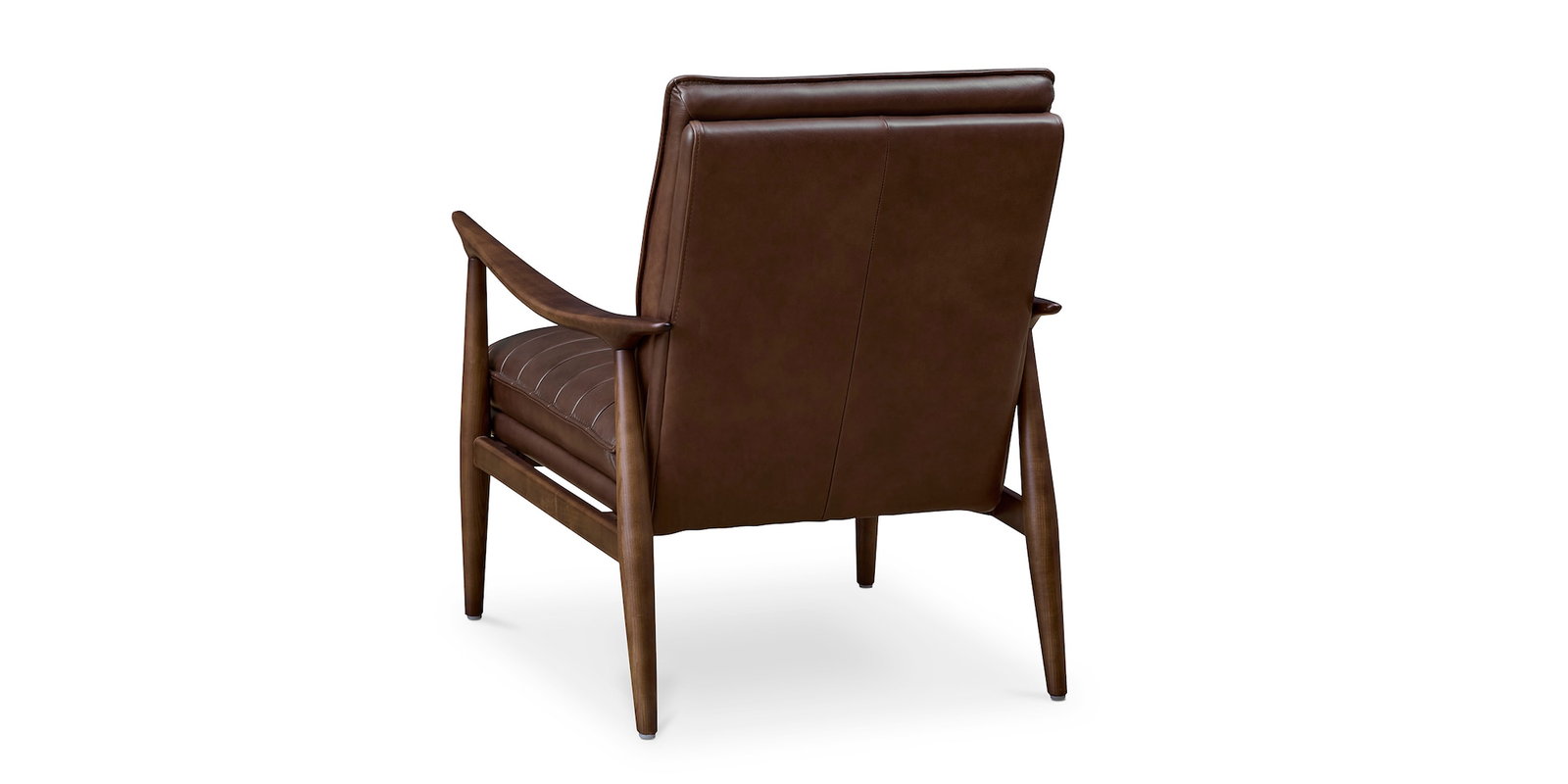 Product Description: Bassett Furniture 1338-02B Ellis Leather Accent Chair - Leather: Ellis Brown. Claim the retro-cool Ellis Chair for your personal statement of luxe comfort. With an open silhouette and contoured frame crafted from solid birch, the Ellis Chair is more than an accent chair…it carries a lifestyle impact. Beautiful top grain leather, semi-aniline dyed and protected, cradles you in temperate comfort whether seated fireside or elbowed-up to a sunlit nook. Choose from either matte Mushroom or glossy Brown leather to add a tad of Scandinavian-inspired style to your room. Also, be sure to add an Ellis Ottoman for extended comfort.