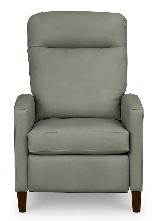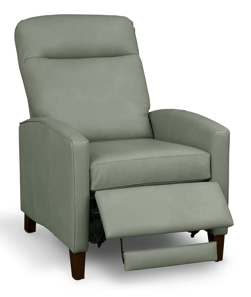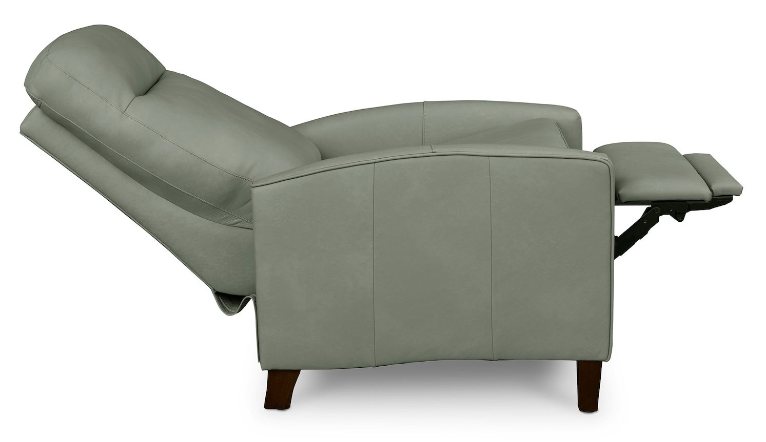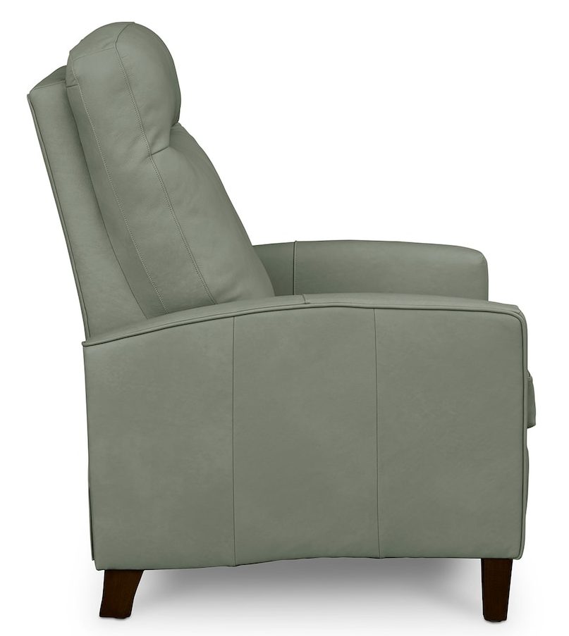Product Description: Bassett Furniture 1342-3TL Emmett Leather Track Arm Power Recliner - Our Emmett Leather Track Arm Power Recliner operates undercover to deliver reclining relaxation to your modern living room. With a channeled headrest and tapered wood legs, Emmett’s accent-chair appearance camouflages the heart (and mechanics) of true reclining comfort. Style the chair in your preference of any fine Bassett leather, cushion the seat to your comfort level, and choose a finish for its legs. The Emmett recliner is also available at either standard or tall back height, with your choice of manual push arm or power mechanism to adjust your recline.