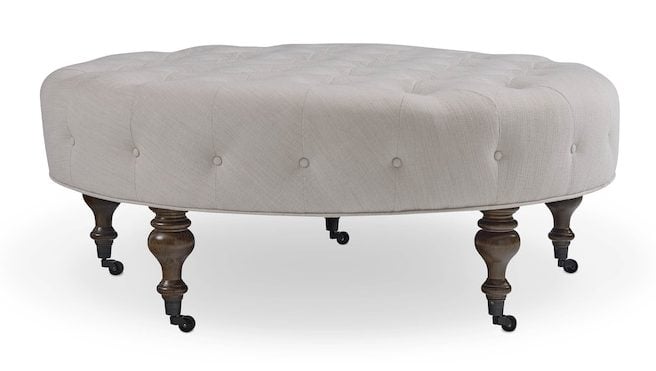 Product Description: Bassett Furniture 1410-45RT-1628-0-BRASS-BF808 Belwood Tufted Round Ottoman - Picturing your room, almost any room, with a Belwood Tufted Round Ottoman at its center is like imagining your dream home. Round out your vision by choosing customized upholstery for the plushly tufted top, then select the finish for its turned wood legs. You can even choose the metal finish for the casters. The Belwood’s distinctive geometry has a special affinity for modern décor while its tufting, turned legs, and casters speak of design details anchored in time-honored tradition. This ottoman series also includes rectangular or square styles and leather upholstery options.