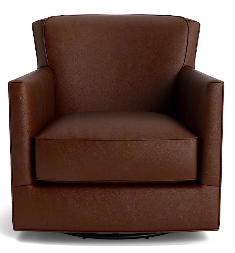 Product Description: Bassett Furniture 1745-05L New American Living Leather Thin Track Arm Swivel Chair - Our New American Living Leather Thin Track Arm Swivel Chair adds a luxe leather swing to your style. Swivel into relaxation in any room with this chair that’s scaled for maximum adaptability and designed for optimum comfort. The New American Living’s padded back and boxed, welted seat cushion can comfort you through long nights in a nursery, a multi-season binge session in your living room, or even the latest bestselling page-turner in your home office nook. Your choice of fine Bassett leather upholstery provides custom color options with a durability that ages into elegance.