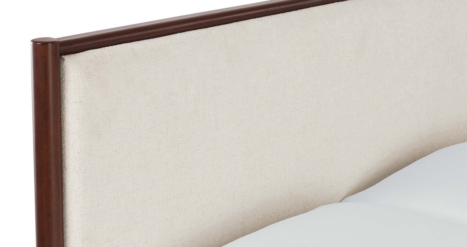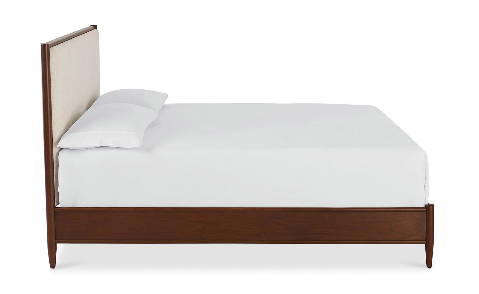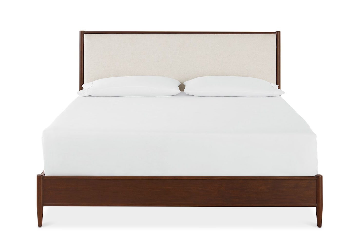 Product Description: Bassett Furniture 2535-K166 Copenhagen King Upholstered Bed - Employing the classic characteristics of Danish mid-century modern design, the Copenhagen Upholstered Bed delivers a more softly styled interpretation featuring an upholstered headboard. The linen blend fabric of the headboard is framed in the warmth of American walnut, creating an oasis of tranquility while honoring your modern casual style. The espresso-finished walnut is emphasized by rounded trim detail that flows into the elegant legs from its clean-lined frame. The Copenhagen bed is available in Queen, King, and California King sizes with a headboard-only option also available.