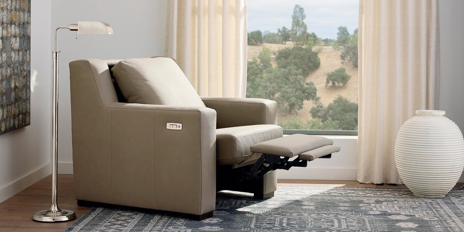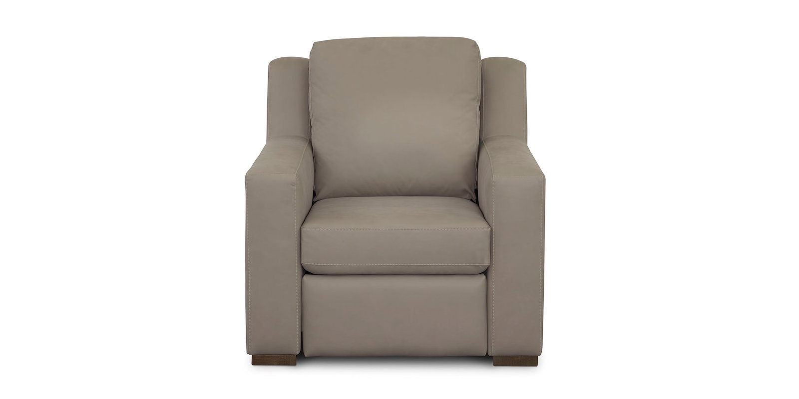 Product Description: Bassett Furniture 2900-12ML Somers Leather Reclining Chair - Leather: Sofia Taupe. Our Somers leather reclining chair is your recliner that doesn't look like a recliner. The Somers speaks the modern language of your style, showing off its fresh, clean lines – large track arms, low block legs, and removable box back pillow. Then, when you're ready, it goes into casual living mode, reclining to a full range of positions that even includes zero gravity. Its frame-within-a-frame design allows you full flexibility to place the chair wherever it works best in your space. Customize your chair with your choice of seat cushion, fabric, or leather, even an optional battery pack.
