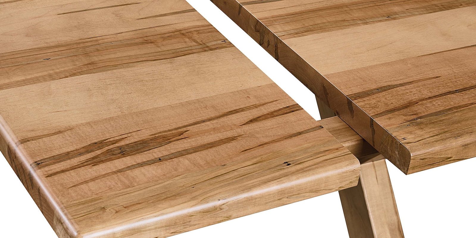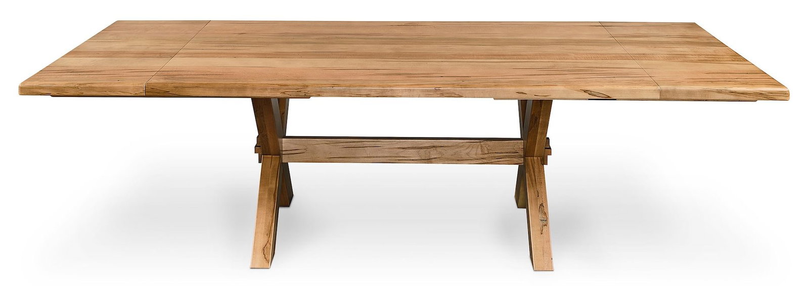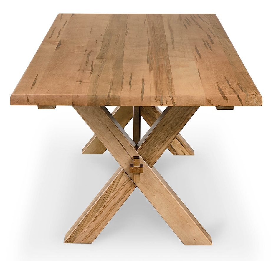Product Description: Bassett Furniture 4021-7242XEX Crossbuck Dining Table with Extendable Leaves - One of our most unique products, the Crossbuck Dining Table with Extendable Leaves couples the beauty of a solid wood tabletop with the functionality of extension leaves. Whether you choose live edge or straight, one solid piece of wood is used to build the Crossbuck table top and its leaves. When you add the leaves to your table, the wood grain and edge shape continue uninterrupted, thus making large gatherings both easy and authentically styled. The Crossbuck table is available in homegrown maple with your choice of finishes, accompanied by sustainably produced fabric storage bags for the leaves. Answer your serving and styling needs by pairing this table with our Hawkins Huntboard, which is available in the same maple wood and finishes and equipped with a designated leaf storage drawer.