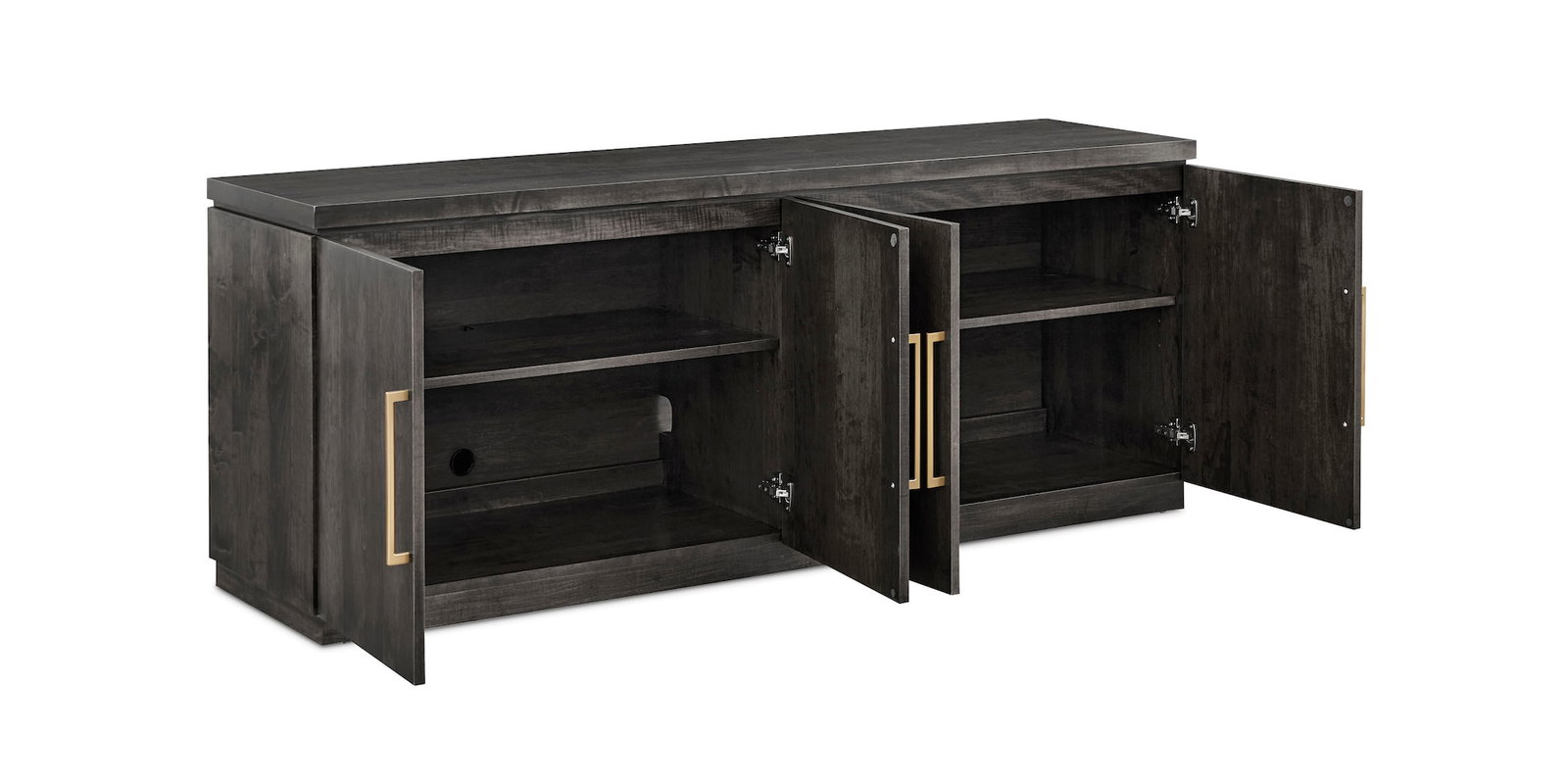 Product Description: Bassett Furniture 4025-3076C-CBBNPULL Smythe Sideboard - Finish: Origins Carbon. The Origins Smythe Sideboard is stylish storage that doubles as an added serving surface to complete the look and full-service function of an Origins dining space. Featuring 4 doors with soft-close European hinges, each pair of doors opens to adjustable shelf storage. Standard 10” bar pulls are available in Black Nickel or Brass, with the option to upgrade to Cast & Forge hardware for more customization. Like all the Origins furnishings, the Smythe Sideboard is available in three radiant finish colors – Carbon, Sable, and Natural. Hidden wire management allows for multi-functional use for this do-everything-with-style storage piece.