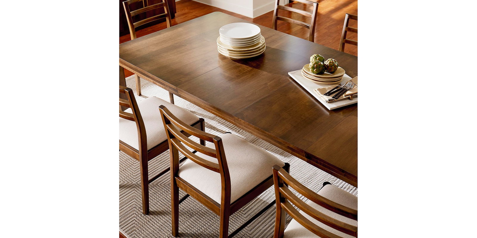 Product Description: Bassett Furniture 4025-4260S1L Dandridge Rectangle Dining Table with Leaf - Wood Finish: Origins Sable. The Origins Dandridge Rectangle Dining Table is designed to accommodate family needs and flexible spaces in chic, modern style. The rectangular table, with its Maple veneered top and solid Silver maple legs and aprons, can easily host family meals or homework sessions. Choose your preferred table width from two options. And when the gang gets oversized, you can add one (included) or two (optional) leaves, allowing the table to morph as needed for your space and lifestyle. The Dandridge table is available in all three of the Origins finishes, as well as in a smaller square table, also with leaf options. The leaves have an apron design that matches the table apron.