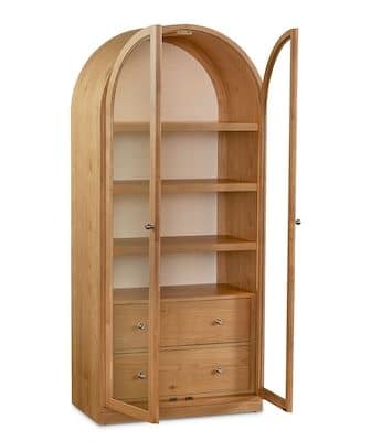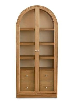 Product Description: Bassett Furniture 4544-0682 Newbury Arched Cabinet - This distinguished cabinet combines timeless elegance with modern simplicity, featuring clean lines and subtle texture to beautifully frame your display. Its classic arched silhouette works seamlessly in a living room, entryway, or dining space. Built-in lighting and a textured wallpaper back panel highlight your favorite pieces, while full-length glass doors and two lower drawers provide both protection and practical storage. It’s available in a natural finish or Newbury’s signature hatched-gesso finish.