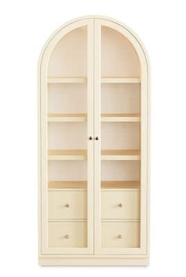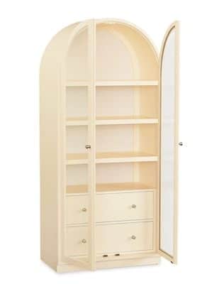 Product Description: Bassett Furniture 4944-0682 Newbury Arched Cabinet - The Newbury Arched Cabinet offers clean lines and textural interest to frame and style your shelf display as intentionally as you style the room it’s in. The arched shape is timelessly classic, yet rendered with modern simplicity – it can just as easily belong in your living room or entryway as in your dining room. Use the built-in lighting and subtly textured wallpaper back panel as the stage for your special pieces. Enjoy 2 drawers of storage below the shelves, and full length glass doors to protect your stored as well as displayed items. The cabinet is offered in both a natural finish and Newbury’s signature hatched-gesso finish.