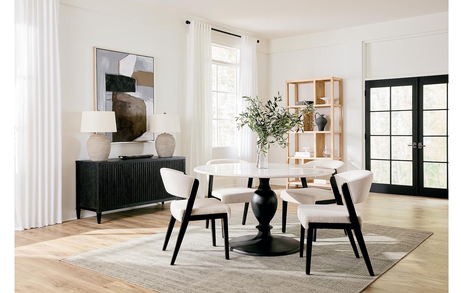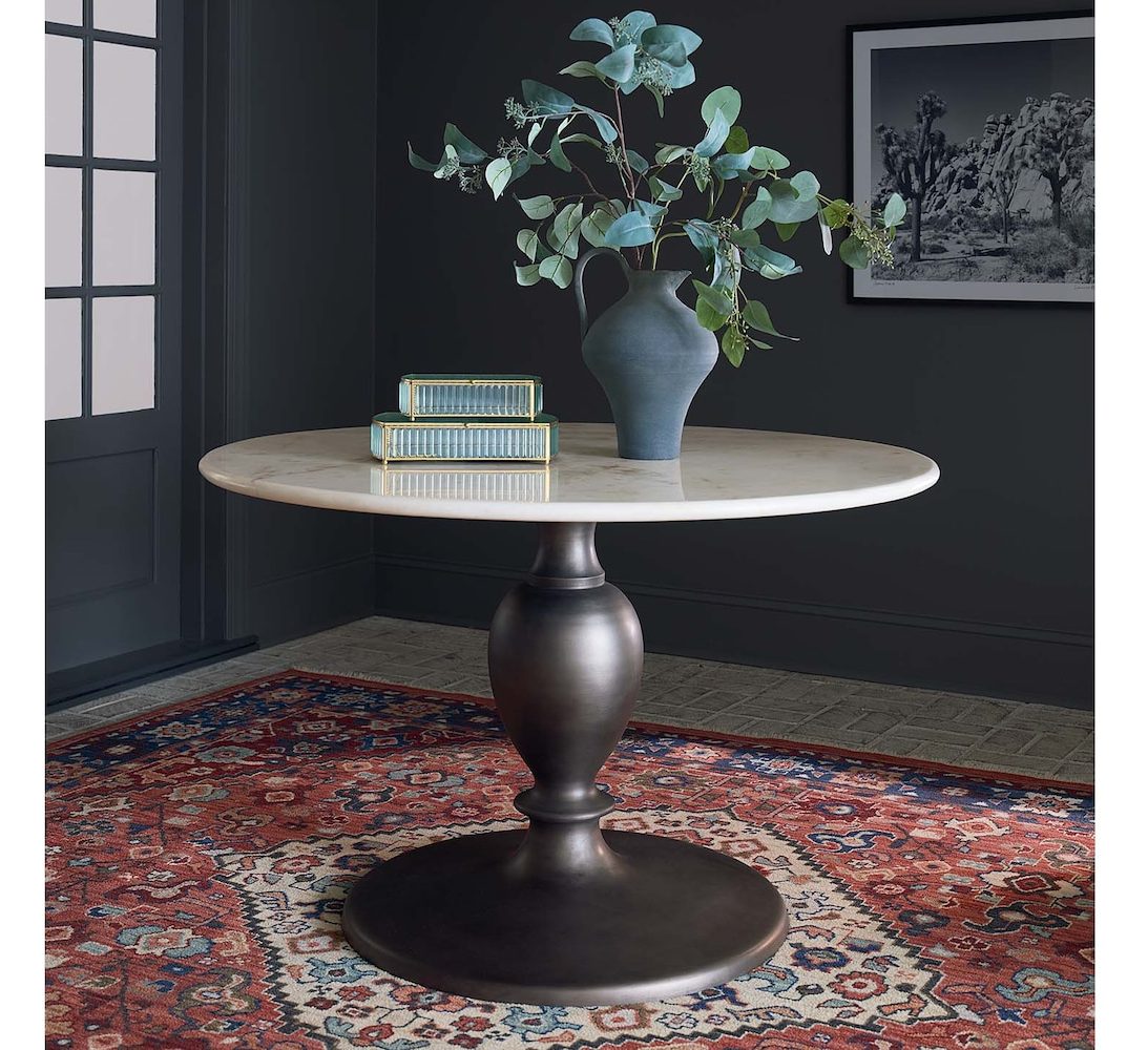 Product Description: Bassett Furniture 4E25-K4848 Coventry Round Dining Table - Your dining space might be the ideal place for this captivating mixed-material Coventry Round Dining Table. Available with either a 48” or 54” tabletop diameter, the Coventry features ½” thick solid Banswara marble anchored to a cast aluminum base in a textured, bronze finish. The table’s round shape and organic styling lends itself to gracious seating in almost any modern space, with the pedestal base leaving room to gather chairs around in easy comfort for all. The Coventry Collection also offers the opportunity to pair your show-stopping dining room table with an occasional table to successfully integrate your overall design plan.