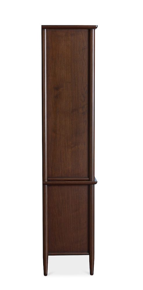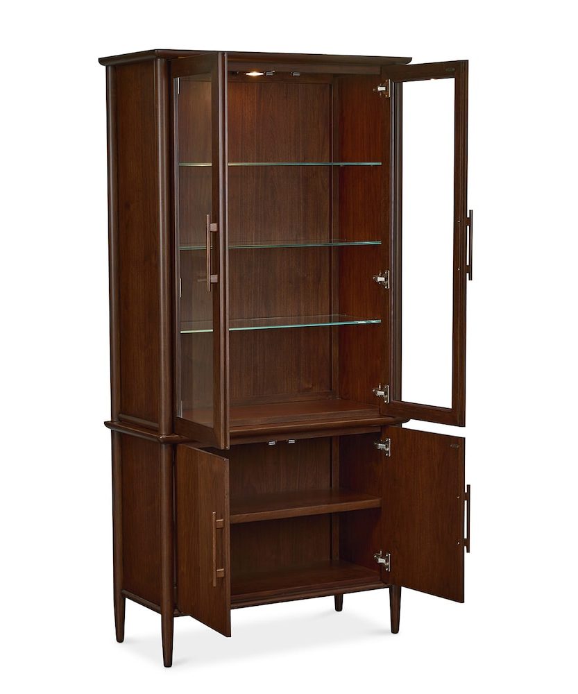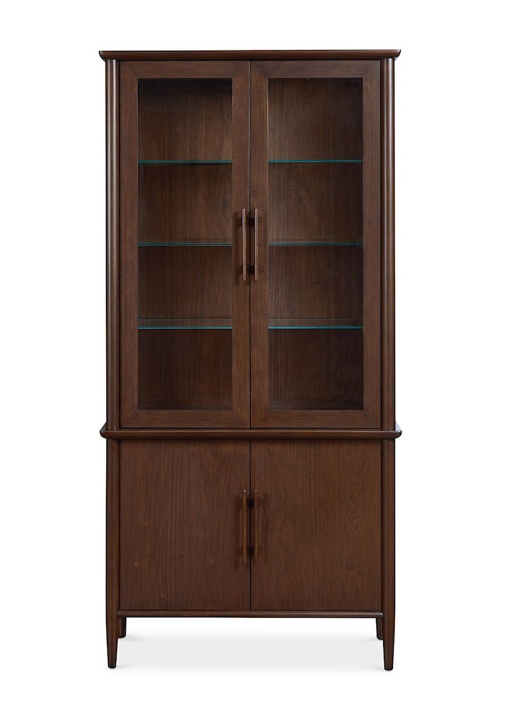 Product Description: Bassett Furniture 6535-0840 Copenhagen Storage Cabinet - The Copenhagen Storage Cabinet offers mid-century modern elegance that allows you to both store and share with style. Rendered in espresso-finished American walnut veneer, the top portion of the glass hutch has two glass doors and three adjustable glass shelves. A touch switch controls three brightness settings. The attached storage base has two wood doors and one adjustable shelf. Like all the pieces in our contemporary Copenhagen Collection, the rounded trim details and solid beech wood handles bespeak an organic elegance rooted in Danish-inspired design.