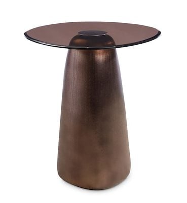 Product Description: Bassett Furniture 6E26-K641 Pantheon Glass Top End Table - Our Pantheon Glass Top End Table offers service with an organically modern style. Like the other occasional tables in this series, this end table leans into a spectrum of design genres – neo-rustic, sleek retro, even warm minimalism. Its base boasts a metallic pewter bronze finish for a subtle shimmer. The biomorphic amber glass top offers a translucent luminosity that adds character without visual heft. Placed wherever you need it, the Pantheon delivers everything you want from an end table.