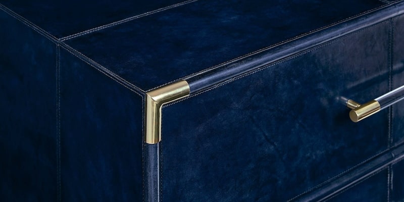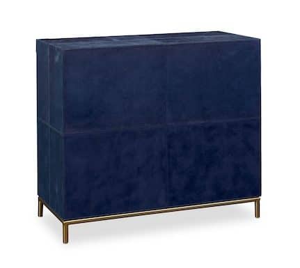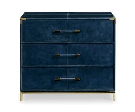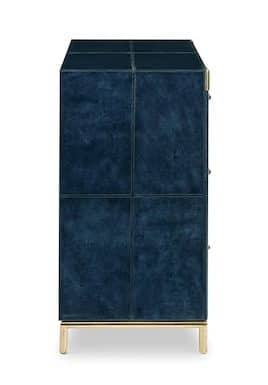 Product Description: Bassett Furniture 6S24-0610 Caspian Accent Chest - Creating a style impact akin to a luxury handbag, our indigo-blue Caspian Accent Chest brings a unique panache to your well-designed space. Add visual and tactile dimension with this chest wrapped in hand-applied, top-grain leather. Let its gold metal base and lucite bar pulls impart a jewelry-like shimmer to any room while storing your stowable goods and treasures in drawers lined with suede. This richly subtle neutral provides a perfect counterpoint to your other furnishings, helping to enhance their attributes as well as bring a special piquancy of its own.