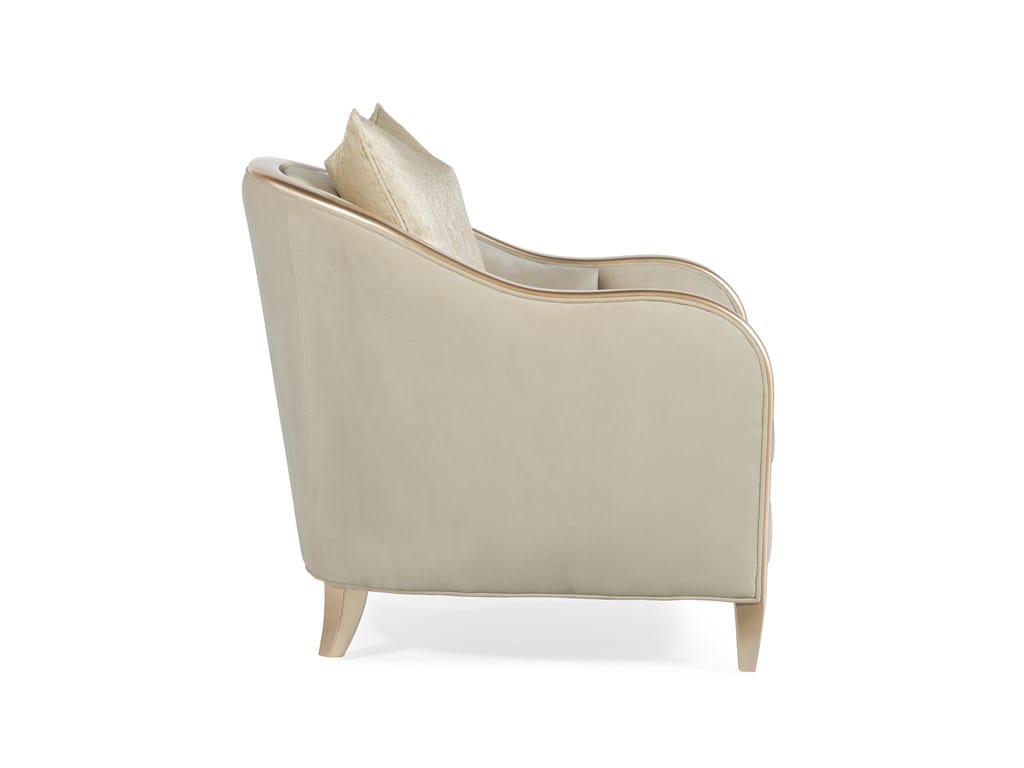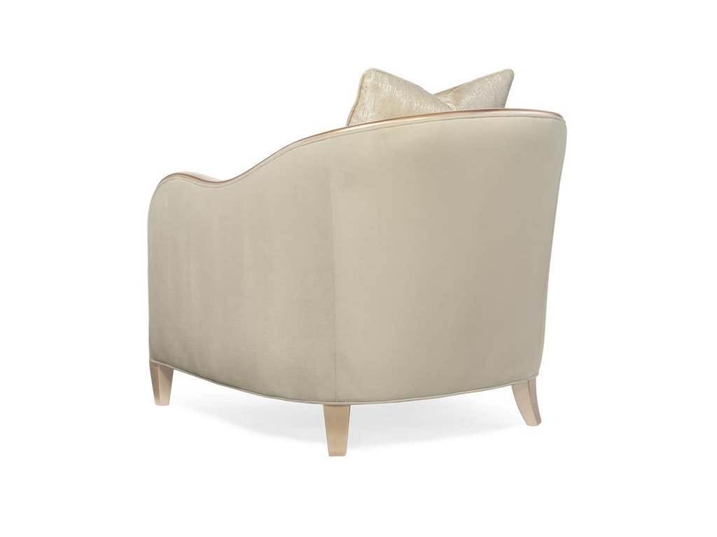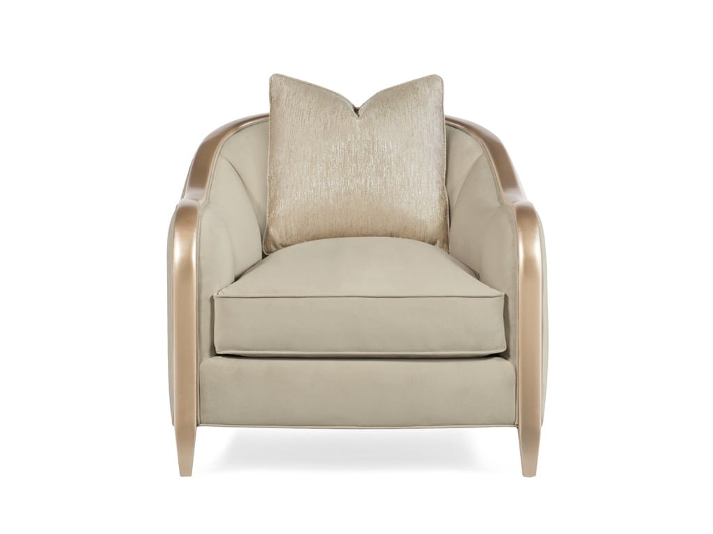 Product Description: Caracole C010-016-033-A Adela Chair - Barrel chairs were never as dashing as this. Fully-dressed in sumptuous oyster-colored velvet with tailored stitching and contrasting exposed wood ribbon detailing, this piece is sublimely comfortable. Its back gently curves around the whole piece and is contemporized by a wide top rail that sweeps around the silhouette. Trapezoid legs, painted to match the frame in a shimmering Blush Taupe, add lightness to this piece. Warm and inviting with its dressy satin strie throw pillow, this modern, retro-chic design is tomorrow's future classic statement.