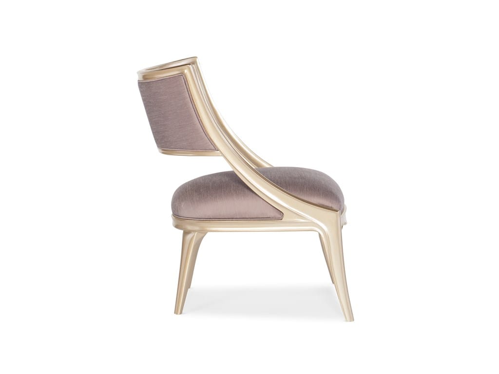 Product Description: Caracole C010-016-131-A Adela Chair - Taking cues from Art Nouveau design and a mixture of architectural elements, this accent chair showcases a continuously flowing silhouette. The suspended concave back features a cantilever design offering a weightless aesthetic. The carved, exposed wood frame is finished in sofa metallic Blush Taupe and offset by a stylish iced Lavender linen blend fabric. Designed to perfectly pair with the collection's other upholstery offerings, this sophisticated chair offers immense versatility when extra seating is needed in any room of the home.