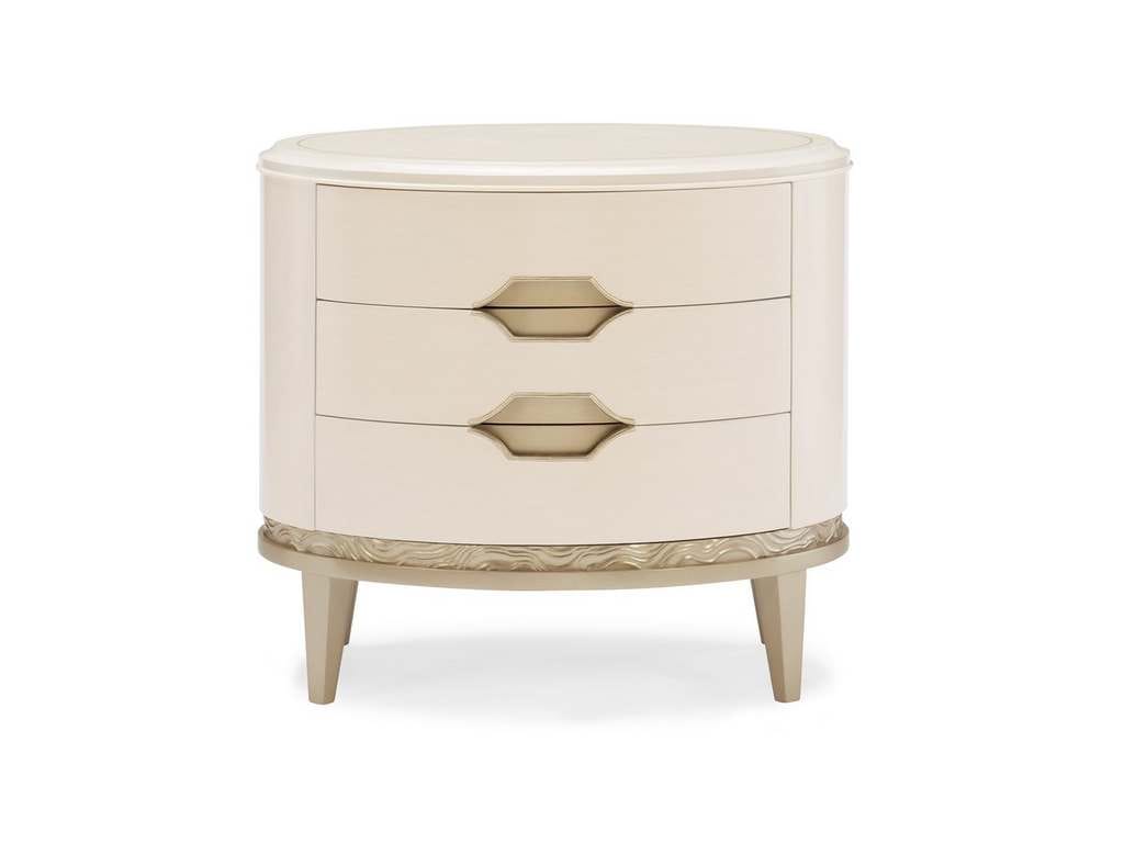 Product Description: Caracole C013-016-063 Adela Nightstand - Why select a traditional rectangular nightstand when you can add an oval statement to your bedroom? This piece, in beautiful Washed Alabaster maple, has three curved drawers. The whole piece sits on a base that is trimmed in a carved ribbon motif, finished in shimmering Blush Taupe, and delicate trapezoid feet. Three drawers with undermount soft close guides. Carved base moulding and legs in Blush Taupe.
