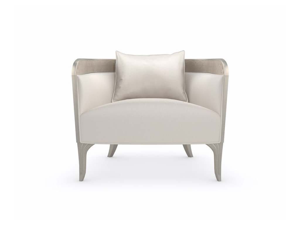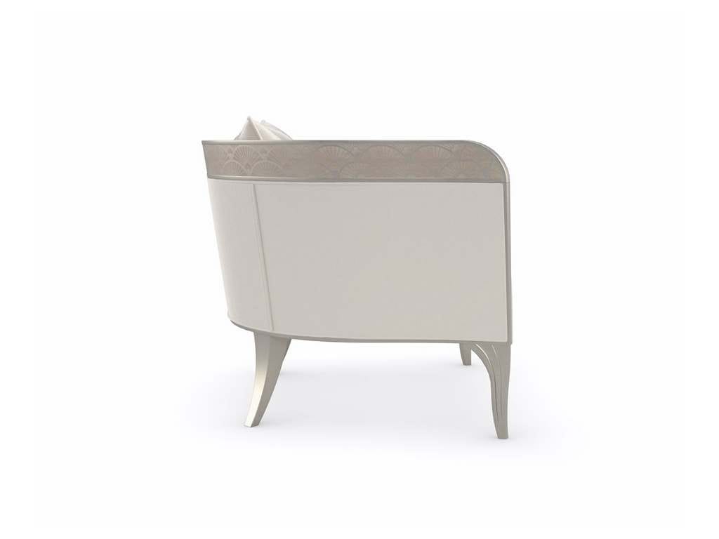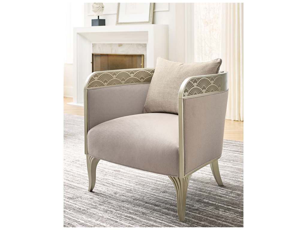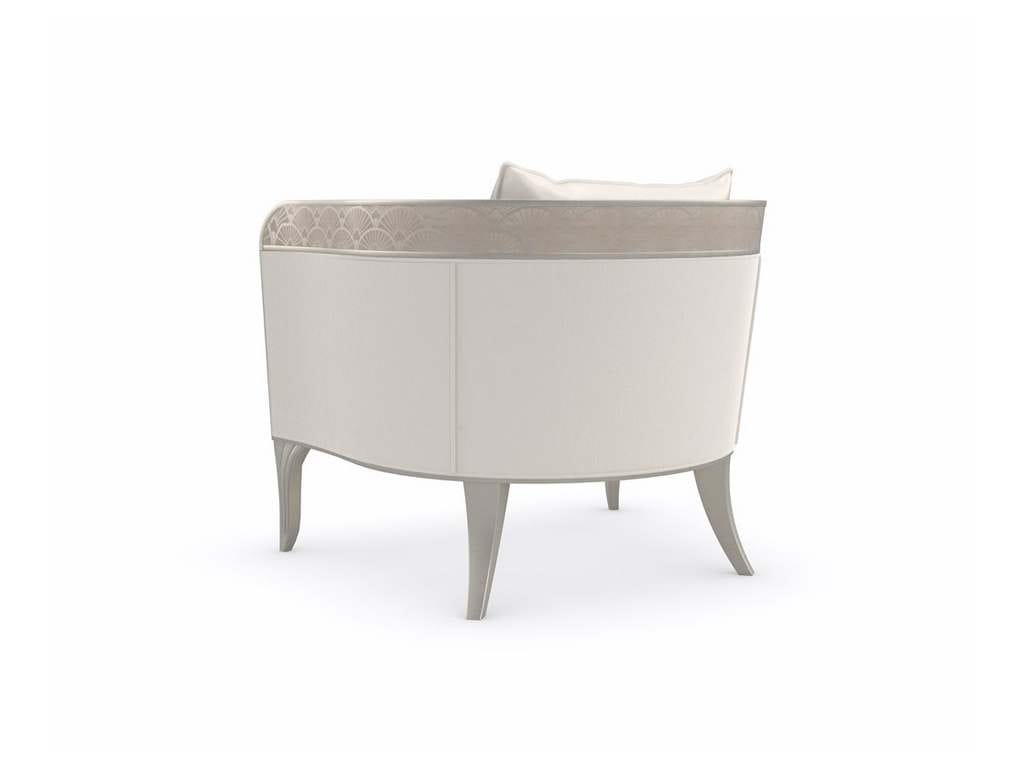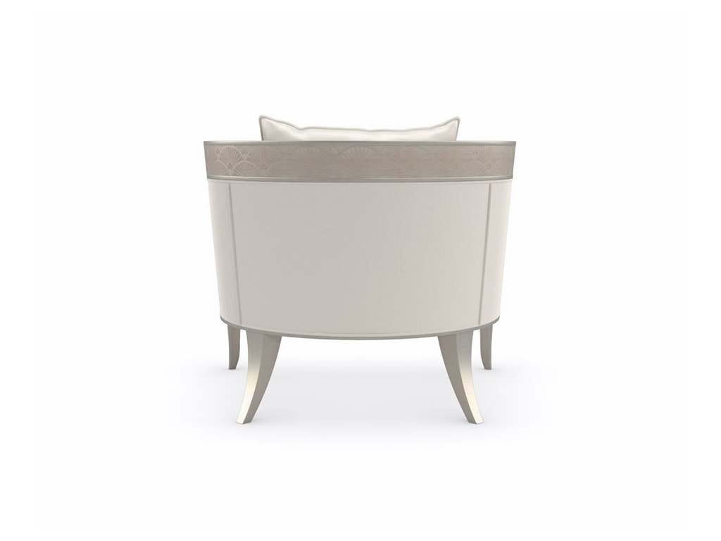 Product Description: Caracole C090-020-131-A Lillian Chair - Beautifully embellished, the Lillian accent chair makes a luxe statement and adds refined comfort to conversation areas. Wrapping the inside and outside of its elegant barrel-back, a silk screened fan motif introduces a modernized Art Deco element in Soft Radiance paint. Fine tailoring in a cream ottoman weave fabric also wraps the inside and outside of its enveloping silhouette, poised on carved legs that curve outward on the back. For a finishing touch, we've added a toss pillow in shimmering grasscloth satin.