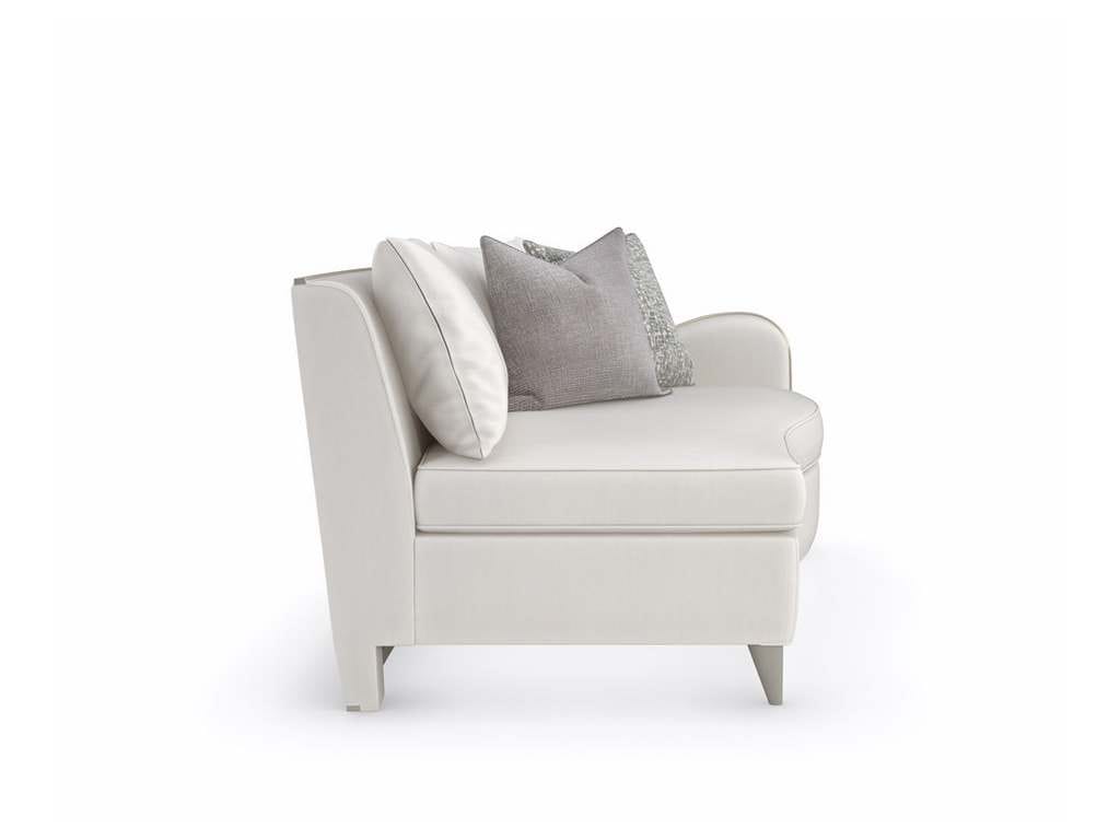 Product Description: Caracole Furniture C090-020-RS1-A Lillian RAF Sofa - An elevated take on the sectional sofa, this design mixes the art of glamour with luxurious comfort. Lightly reflective in a lustrous, low-pile chenille, its curved arms and shapely silhouette are embellished with wood trim in Soft Radiance paint. Features loose seat cushions and back pillows with a classic button-pull detail. Cut velvet and ottoman weave toss pillows add soft contrast and texture in pale lavender and gold tones.