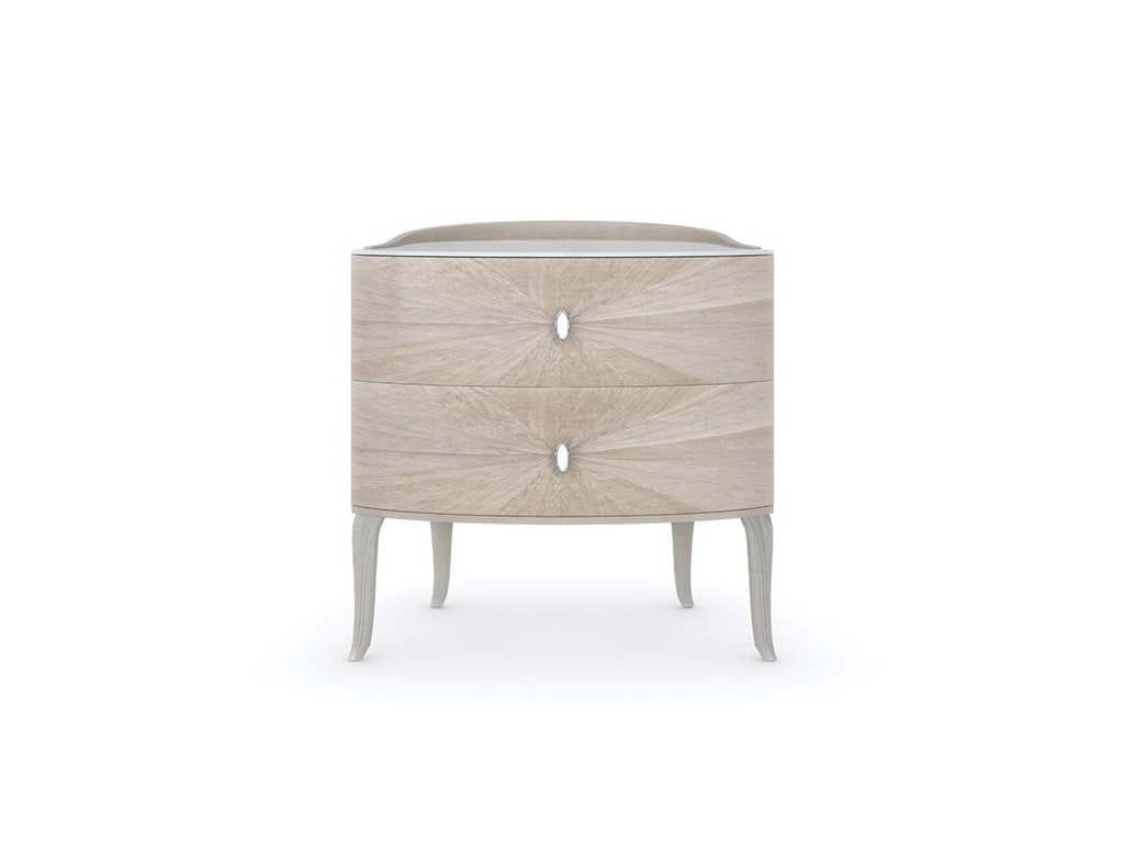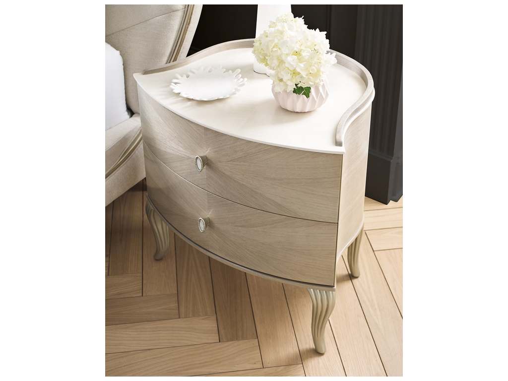 Product Description: Caracole C093-020-061 Lillian Drawer Nightstand - A beautifully bespoke bedside companion, the Lillian small drawer nightstand eloquently mixes glamour with functionality. Exquisite finishes give light to radiating woodgrains, accentuated by carved legs in a Soft Radiance paint. Features a curved top gallery and Art Deco-inspired drawer pulls with a ceramic inset for subtle embellishment.