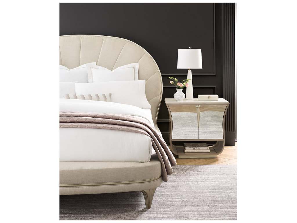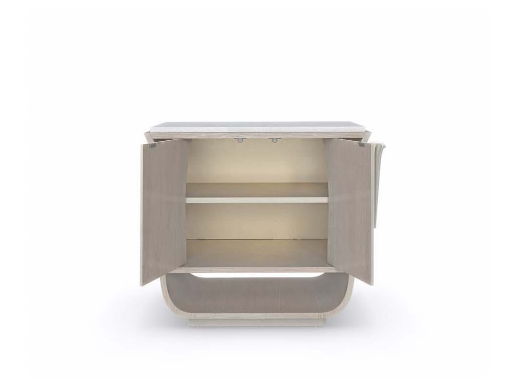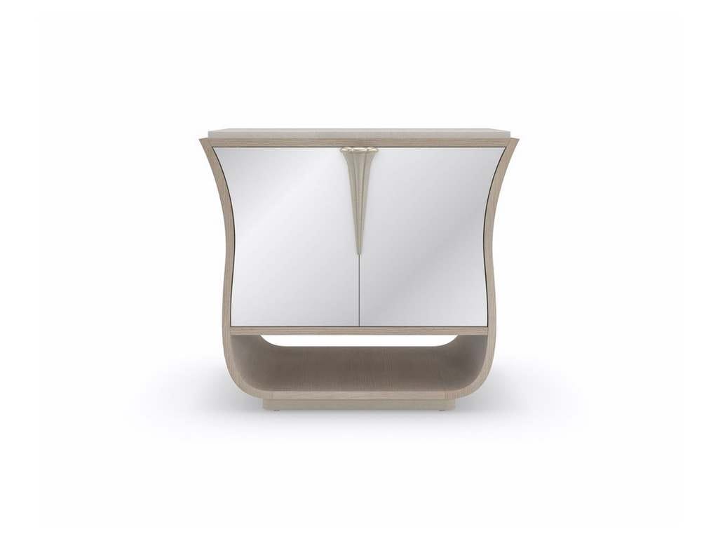 Product Description: Caracole C093-020-062 Lillian Door Nightstand - A mix of wood and stone lends a classic undertone to this lavish design. Mirrored doors add to the allure of its graceful tulip shape, beautifully balanced on a simple plinth base in Soft Radiance paint. Features a fixed shelf on the interior for bedside essentials, with open space beneath for keeping nighttime reads.
