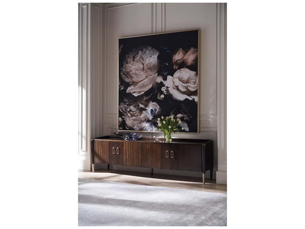 Product Description: Caracole C101-422-531 Oxford The Media Console Entertainment - Reeded center panels and tall tapered legs lend a modern interpretation to Oxford's classic silhouette, pairing dark wood tones with the warmth of gold and marble-like stone for a look of enduring luxury. Features a creamy Karagin stone top for a durable top surface with marble-like gold veins, wrapped by a rounded wood gallery. Reimagined for today's scale and functionality, the Oxford media console offers flexible storage with adjustable shelves and cutouts for wire management.