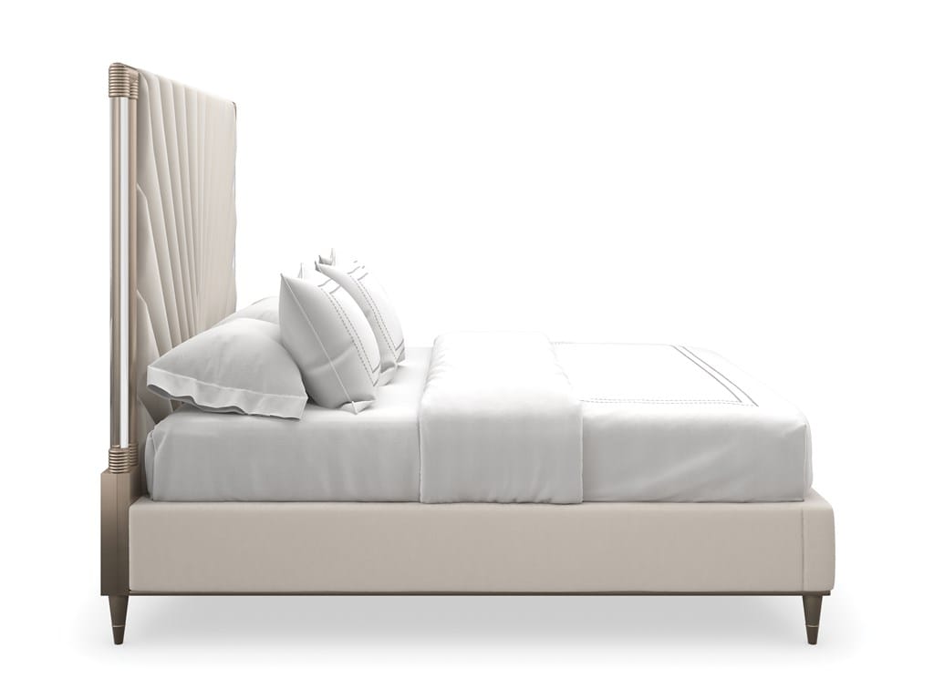 Product Description: Caracole C113-422-101 Valentina Upholstered Queen Bed - Softly radiating with an air of luxury, the Valentina bed features an exquisitely tailored headboard, composed of individual upholstered wedge panels, elegantly framed by clear acrylic posts. Its subtle layering of color and material lends a soothing presence, artfully accentuated by details in a Golden Shimmer finish.