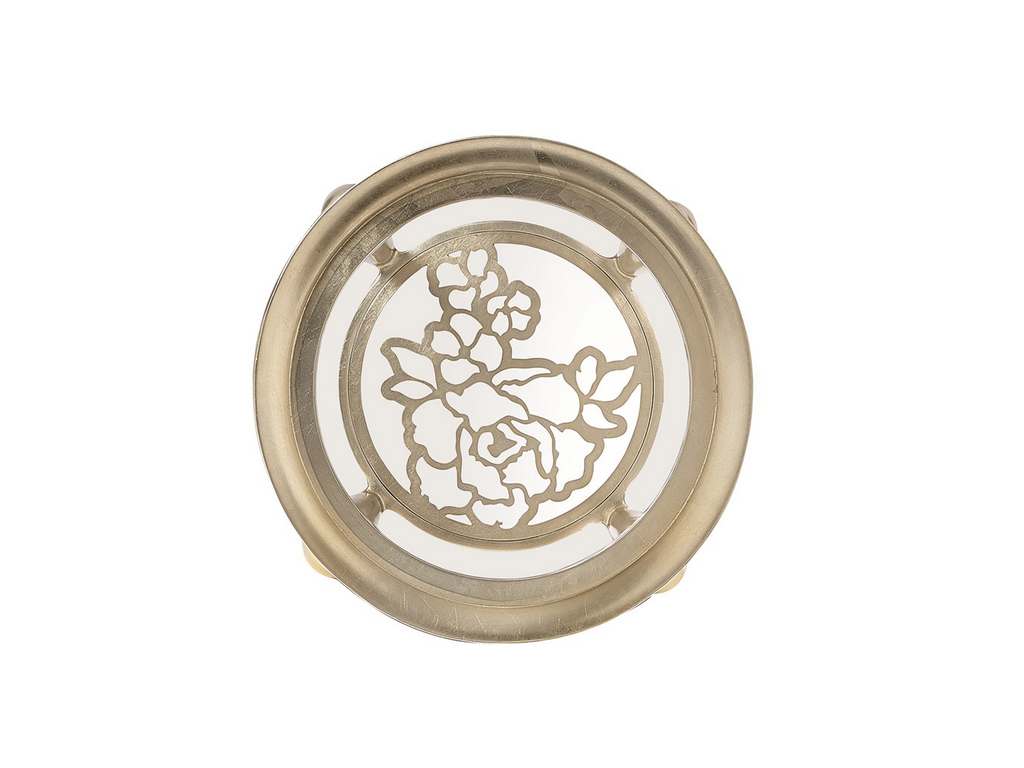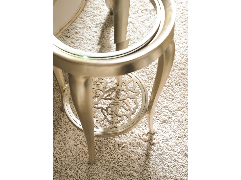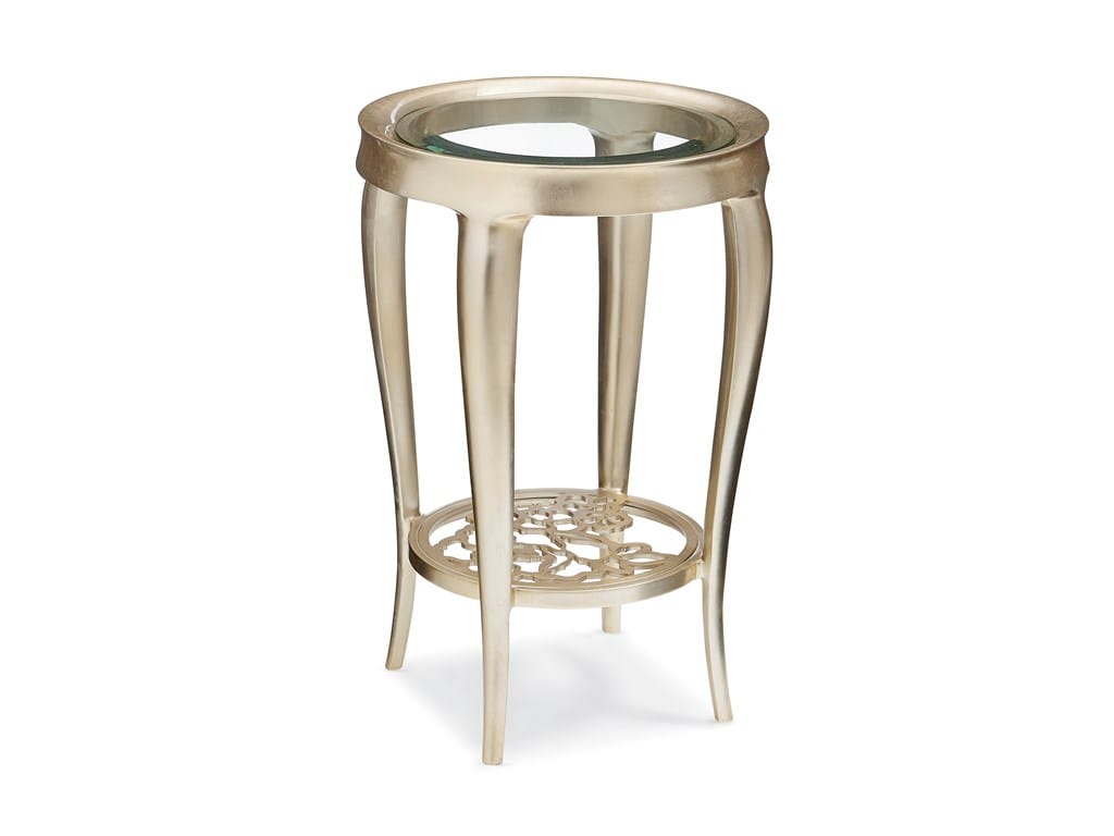 Product Description: Caracole CLA-016-416 Just For You - Cut metal grilles come to life in this end table that easily blends with other designs. This small table is luminous with its beveled glass top surrounded by a wide concave metal apron and graceful cabriole legs, bathed in Oracle silver leaf finish. This petite piece's updated style exhibits a metal stretcher of cutout flowers arranged in a geometric pattern. This bouquet is Just For You.