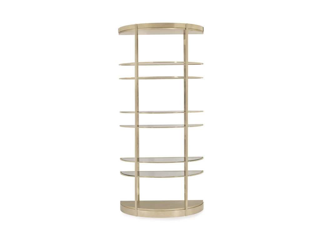 Product Description: Caracole CLA-016-811 Caracole Classic Up Up and Away Etagere - This dramatic, half-moon étagère offers a generous dose of contemporary style in a light and airy piece. The tall frame is high-polished Whisper of Gold metal that surrounds each of the six semi-circular glass shelves and provides its see-through, vertical structure. Adjustable brackets anchor the piece to the wall. With a crown and base in Auric leaf, this silhouette is a clear winner.