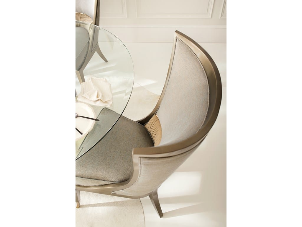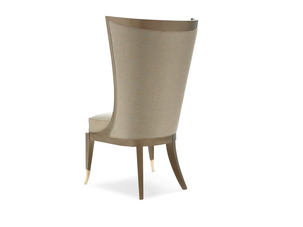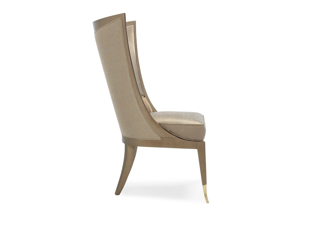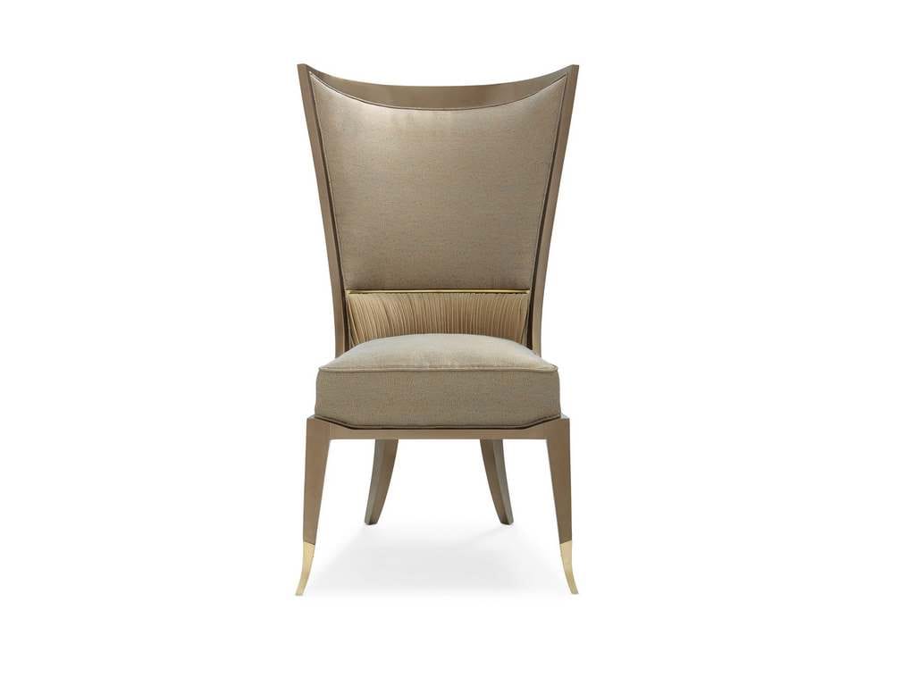Product Description: Caracole CLA-018-282 Collar Up Chair - A little sassy and a little demure, this stunning design makes the ultimate captain's chair or side chair. Its tall winged seat back attracts your attention while a tailored finger-pleat detail along its inside seat back makes it truly unforgettable. Expertly trimmed with a metal bar finished in Champagne Gold, this elegant feature matches the metal ferrules on its front feet. Its luxurious appearance is brought to life in a dressy, neutral-hued pebbled fabric with subtle hints of peacock and gold. At its center, the ruched detailing adds an extra layer of elegance and is tailored in a subtle caramel-colored velvet. A warm Harvest Bronze finish completes the look and accentuates the beauty of this distinctive chair's wood frame and legs.