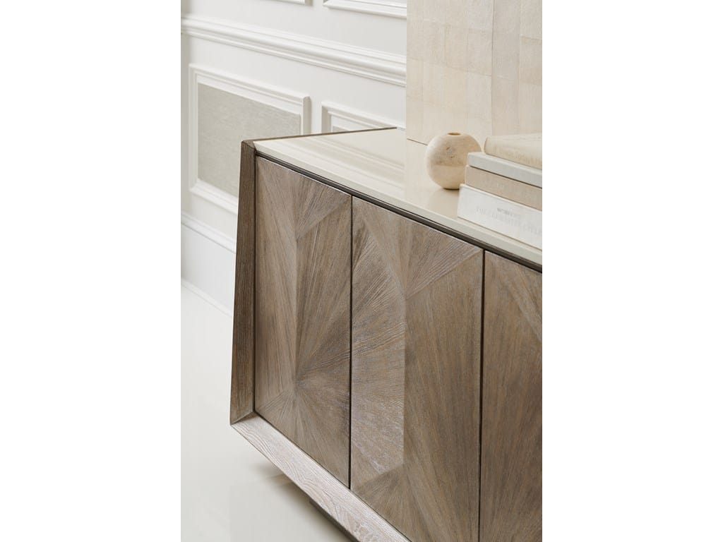 Product Description: Caracole CLA-019-213 Caracole Classic Point Of View Buffet - No matter which way you see this gorgeous console, you can't help but admit it has a lovely Point of View. A straightforward silhouette showcases its extraordinary linear veneer patterns and is topped with a Caracole Cream stone top that ensures usability and durability. Block feet and a soft tonal finish of Ash Driftwood convey its relaxed attitude while a bead of Sundance Gold gives the top edge a touch of luxe. Touch-latch doors open to reveal a fully finished interior painted in Putty with plenty of storage and an adjustable shelf and drawer behind each of its four doors.