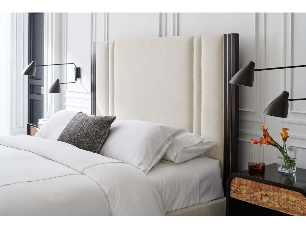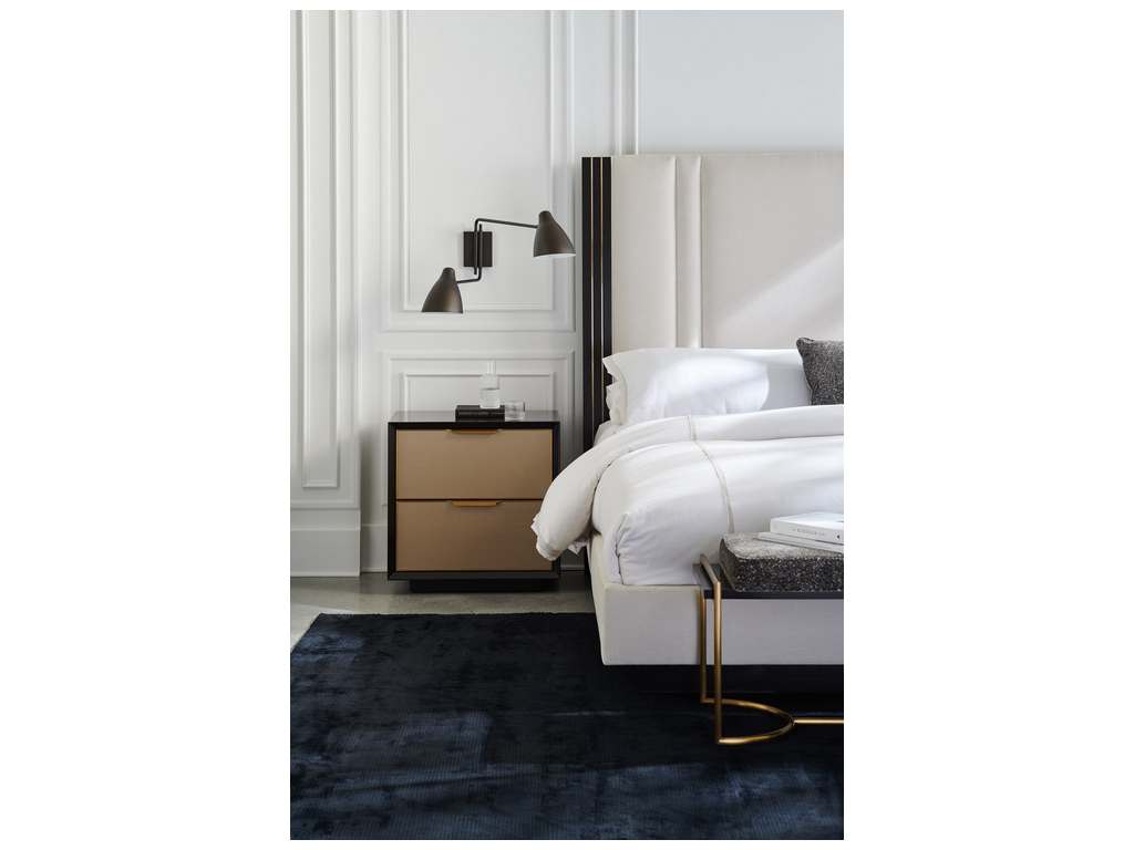 Product Description: Caracole CLA-020-145 Decent Proposal California King Bed - Dashing and distinctly modern, this architecturally inspired bed introduces an updated take on a classic Parsons style. Its dramatic calilfornia king headboard is upholstered in a light-toned performance fabric, richly contrasted by Dark Chocolate trim. An inlaid metal accent in Champagne Gold adds warmth and a sophisticated detail. Fully upholstered side rails and footboard are beautifully balanced on a Dark Chocolate plinth base.