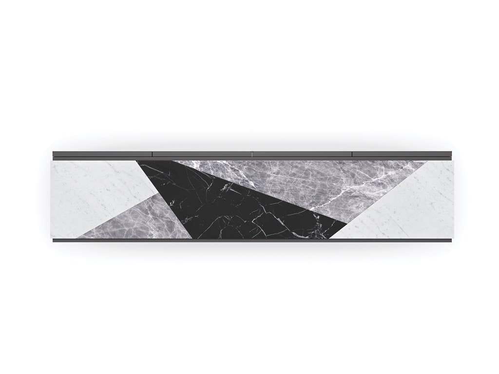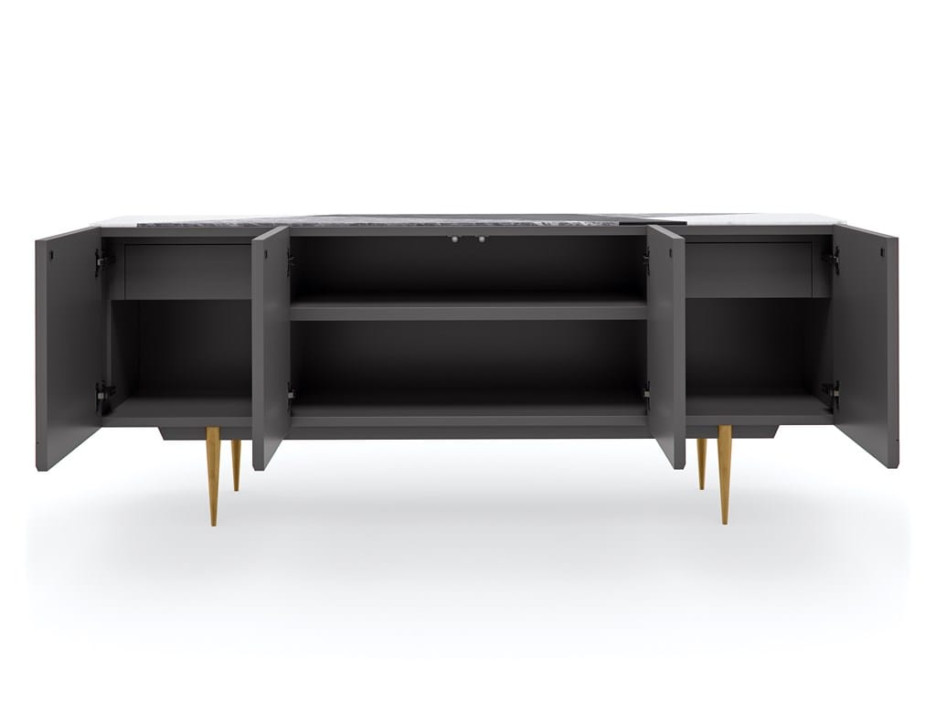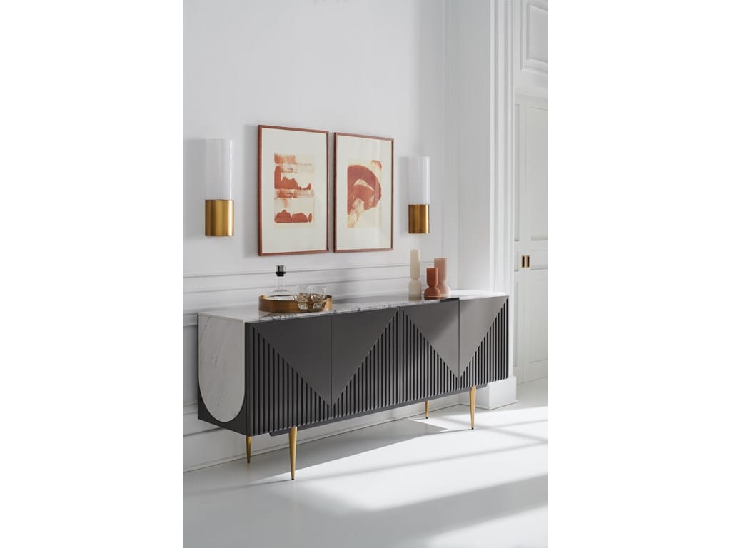 Product Description: Caracole CLA-020-213 Caracole Classic Buffet - Bring a modern form to traditional dining with our Over the Edge buffet, finished in Warm Slate and a mix of polished marble and stone. Graphic slat details add dimension to this contemporary design, balanced on tapered metal legs in Champagne Gold. Perfect for happy hours and hosting, it offers generous storage with two drawers, adjustable shelves and open space, neatly concealed by touch-latch doors. Or, style as a statement-making console in living rooms, halls, and entryways.