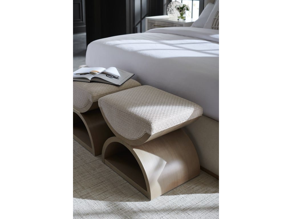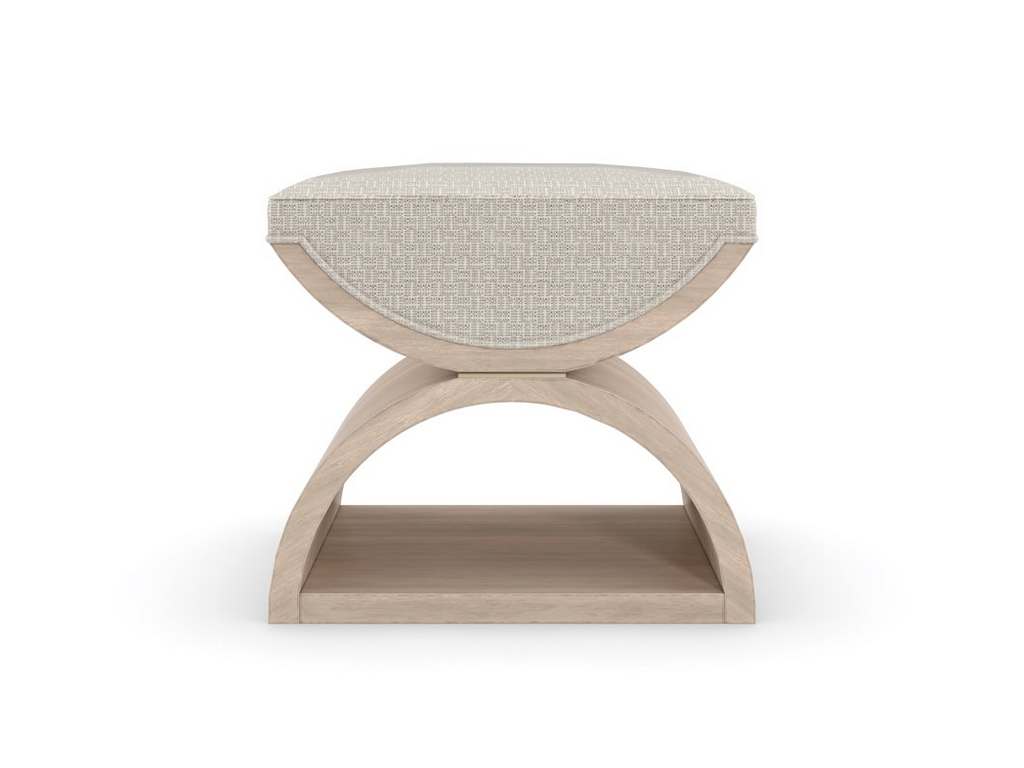 Product Description: Caracole CLA-021-082 Caracole Classic Ottoman - Inspired by a neoclassical design, this double, u-shaped ottoman lends a modern take on the Curule bench, dating back to royal courts of ancient Rome. Versatile and visually alluring, it functions as a seat or ottoman, and when styled in pairs at the end of the bed, makes a luxe landing for getting dressed. Exquisitely tailored in a woven geometric fabric with lustrous accent threads, a plush upholstered seat rests atop its sculptural wood frame-with two crescent shapes separated by a thin band of Majestic Gold and finished in a tonal beige with soft gray undertones.