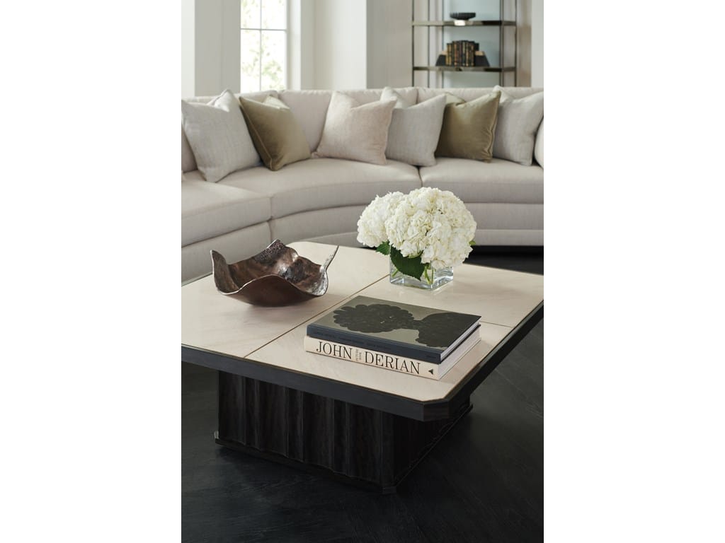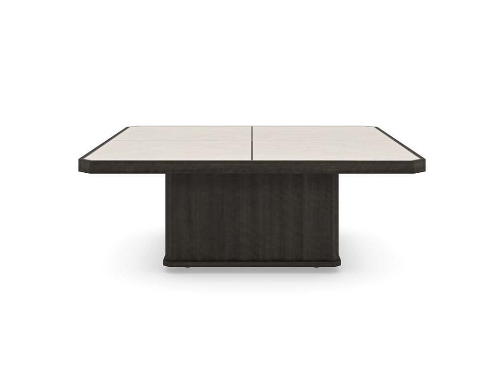 Product Description: Caracole CLA-021-404 Caracole Classic Dining Table - With uncompromising beauty, this classic cocktail table showcases the exquisite veining and coloration found in natural stone. A work of art on its own, its expansive top is crafted from a luxurious Crème Travertine, inset into a Charred Bark wood frame and trimmed in a Majestic Gold metal inlay. A fluted square pedestal-style base adds dimension and a sturdy foundation, with hidden casters for ease of movement. The perfect complement to our Rock On end table.