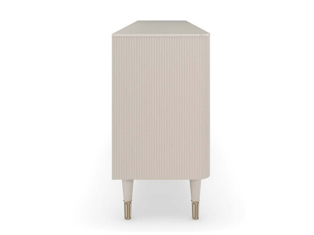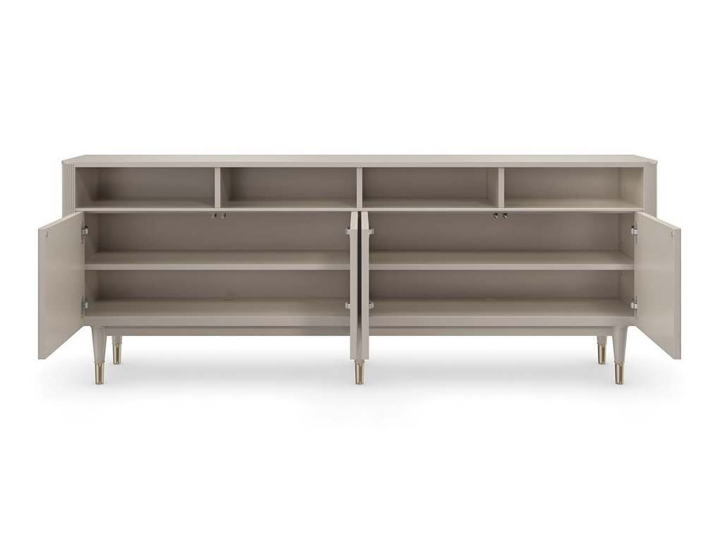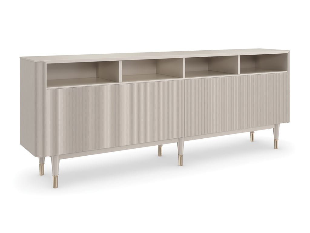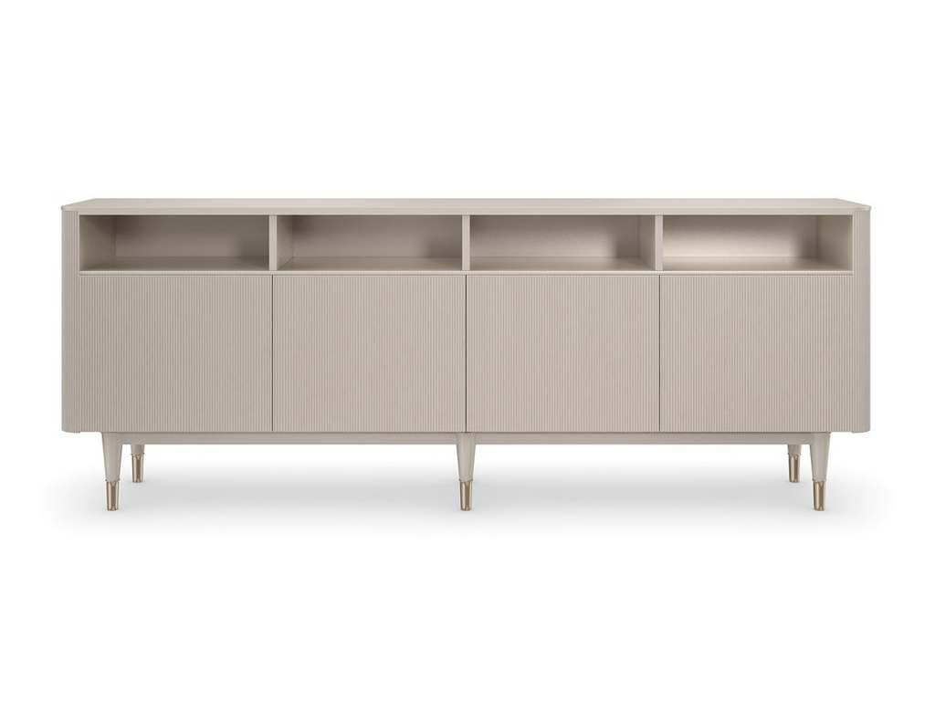 Product Description: Caracole CLA-021-531 Love Lines Entertainment - Tactile reeded door fronts in a Matte Peal finish emphasize this linear design, with a modern-yet-elegant aesthetic that blends with entryways, living or dining interiors. Open cubby spaces offer easily accessible storage above four, touch-latch doors, neatly concealing a Matte Pearl-painted interior with adjustable shelves and cutouts along the back for cord management.